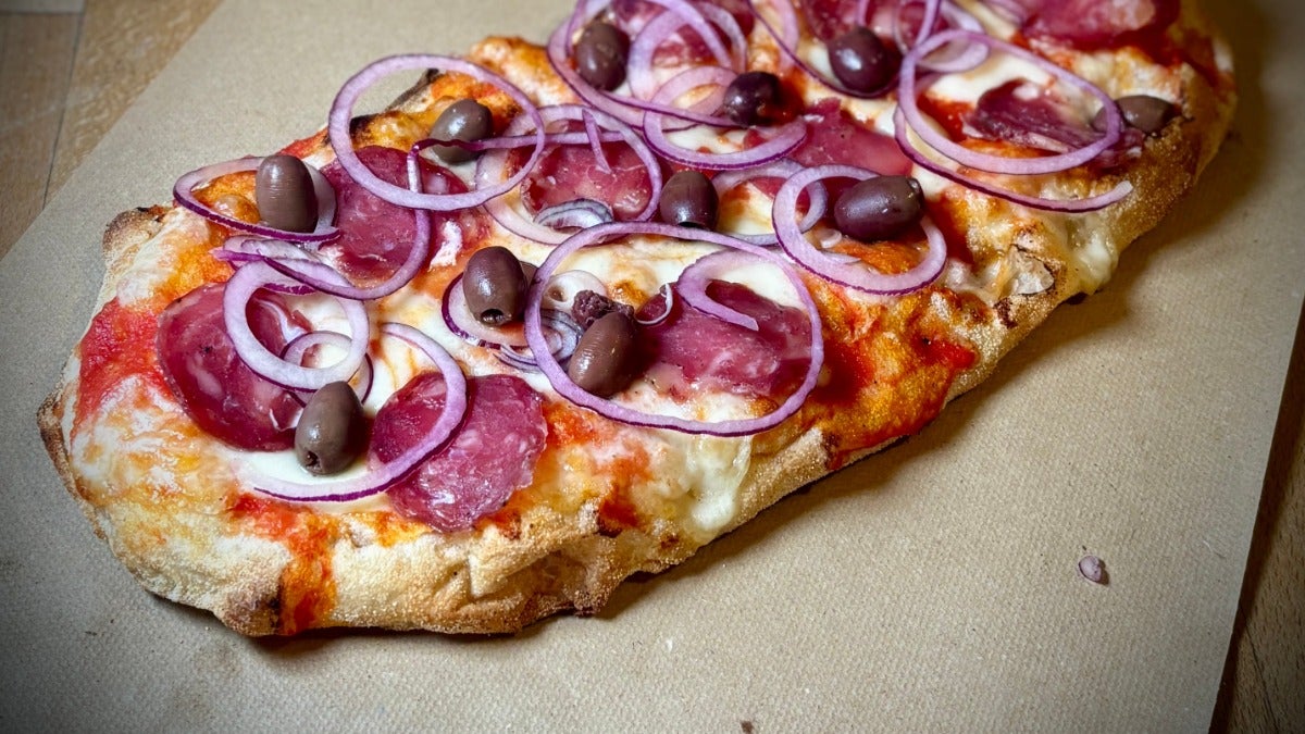 Salsa al pomodoro, mozzarella, salsiccia, olive taggiasche, cipolle rosse e olio EVO. Tomato sauce, mozzarella, dried sausage, olives, red onions and olive oil.€9.00Pinsa Diavola