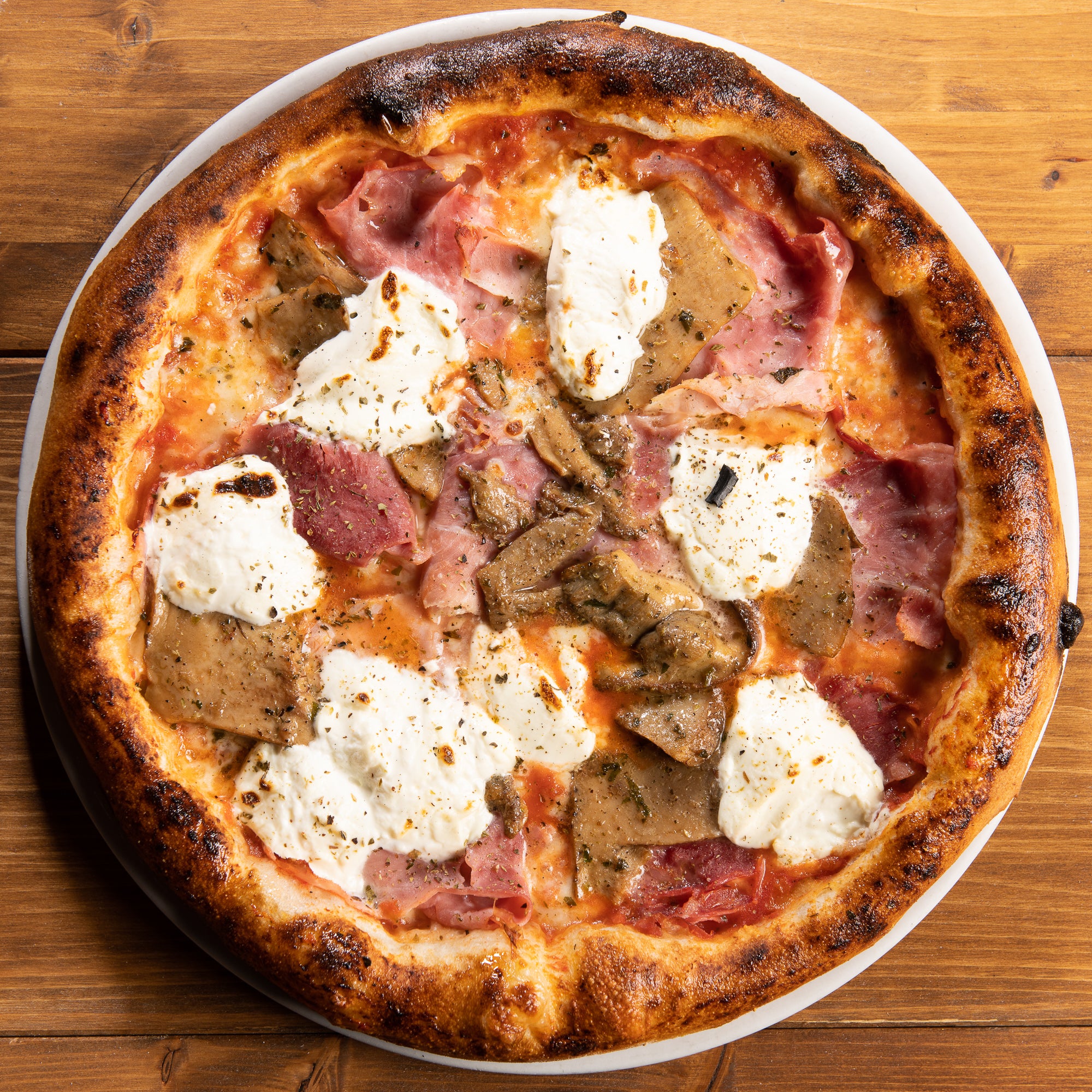 Pomodoro pelato bio toscano, mozzarella, porcini, speck, pecorino toscano DOP fuso, rucola€15.50