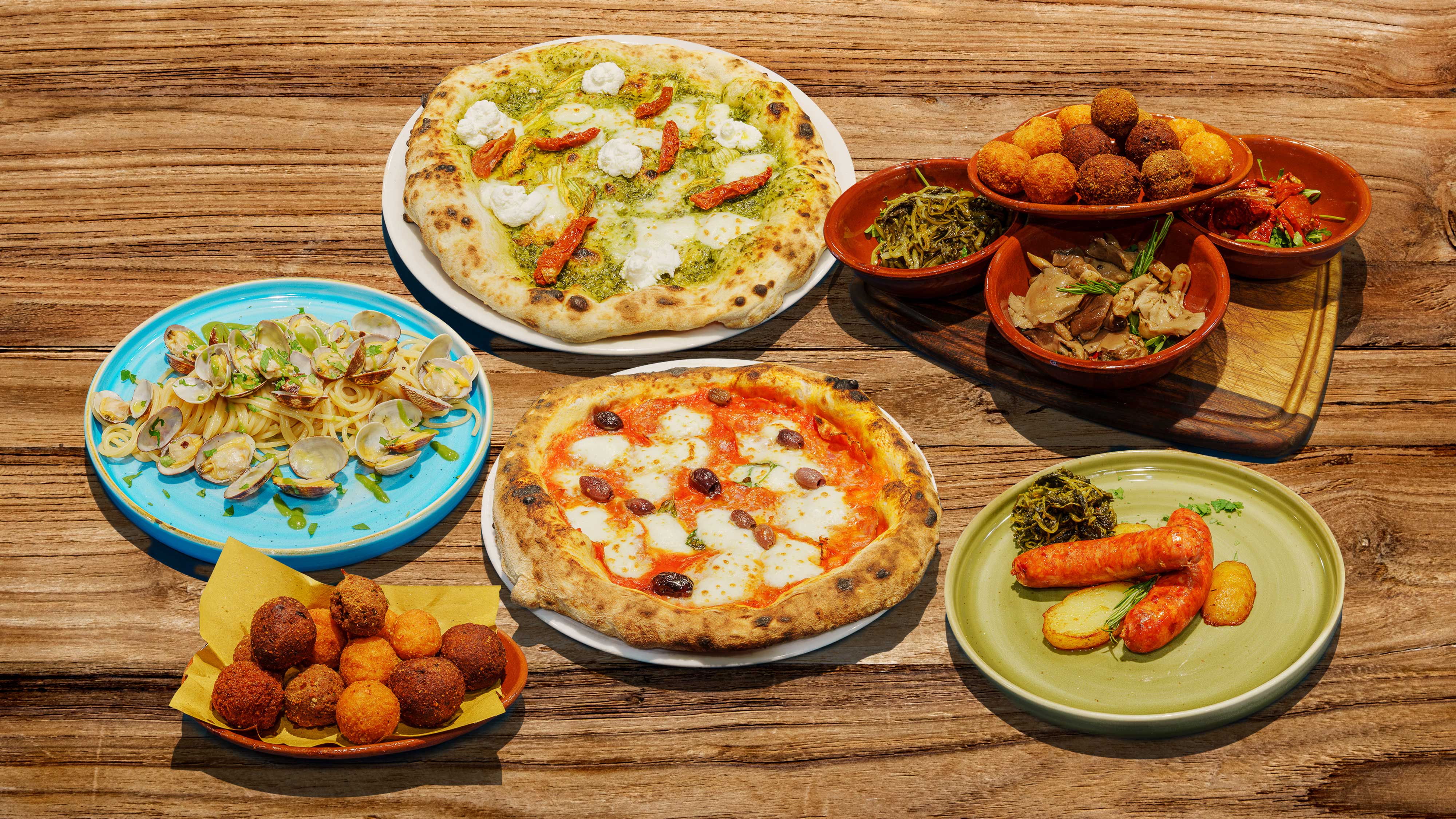 Baccalà con olive nere cotte al forno e peperoni€18.00Salsiccia, cime di rapa e patate silane