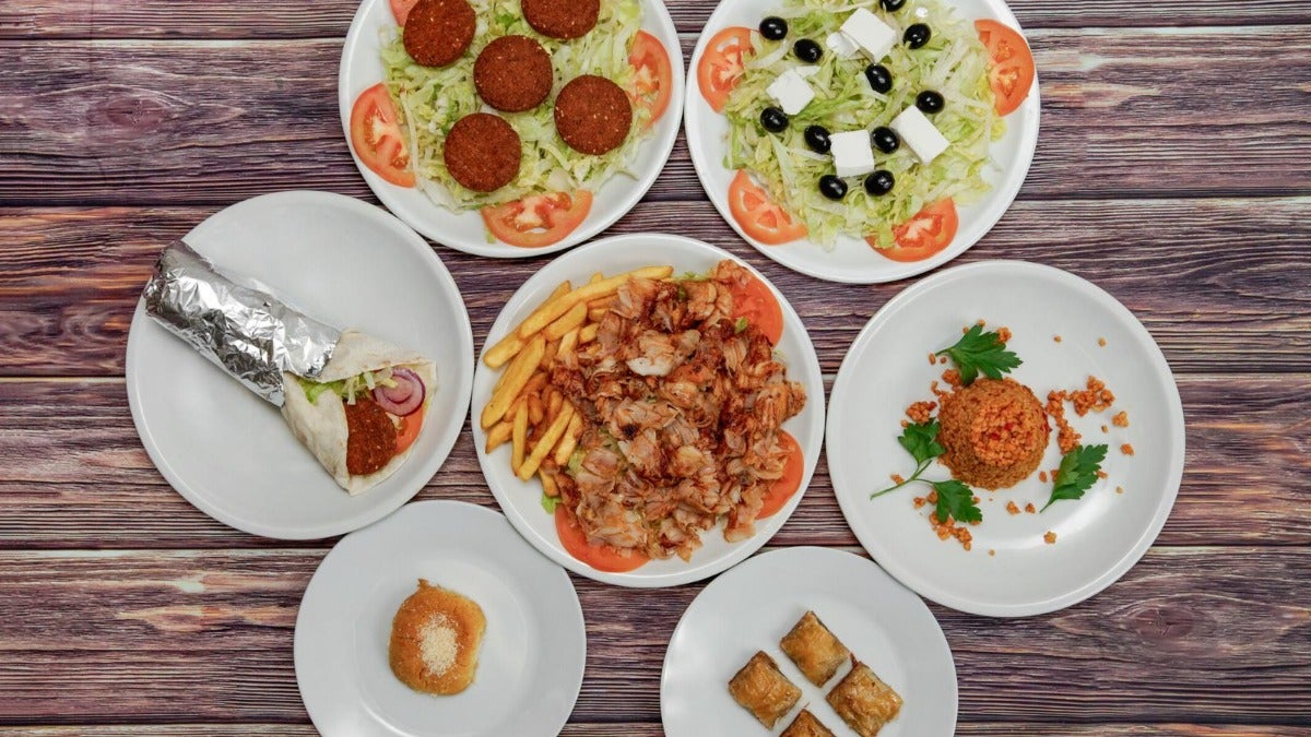 Carne, insalata, pomodori, bulgur, verza, cipolla e salse