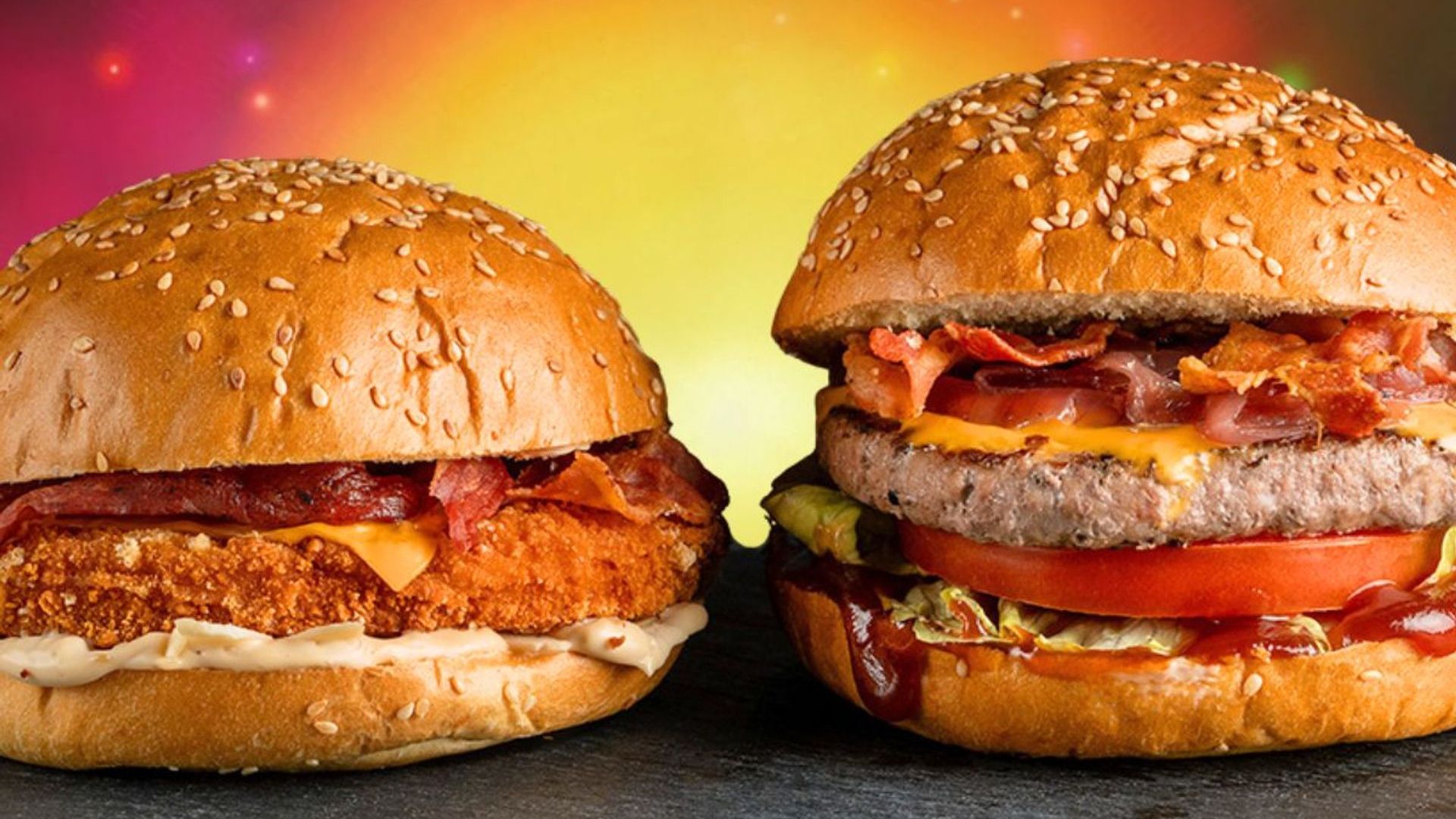 Pane con semi di sesamo, hamburger di bovino, cheddar, bacon, cipolla caramellata, lattuga, pomodoro e salsa BBQ