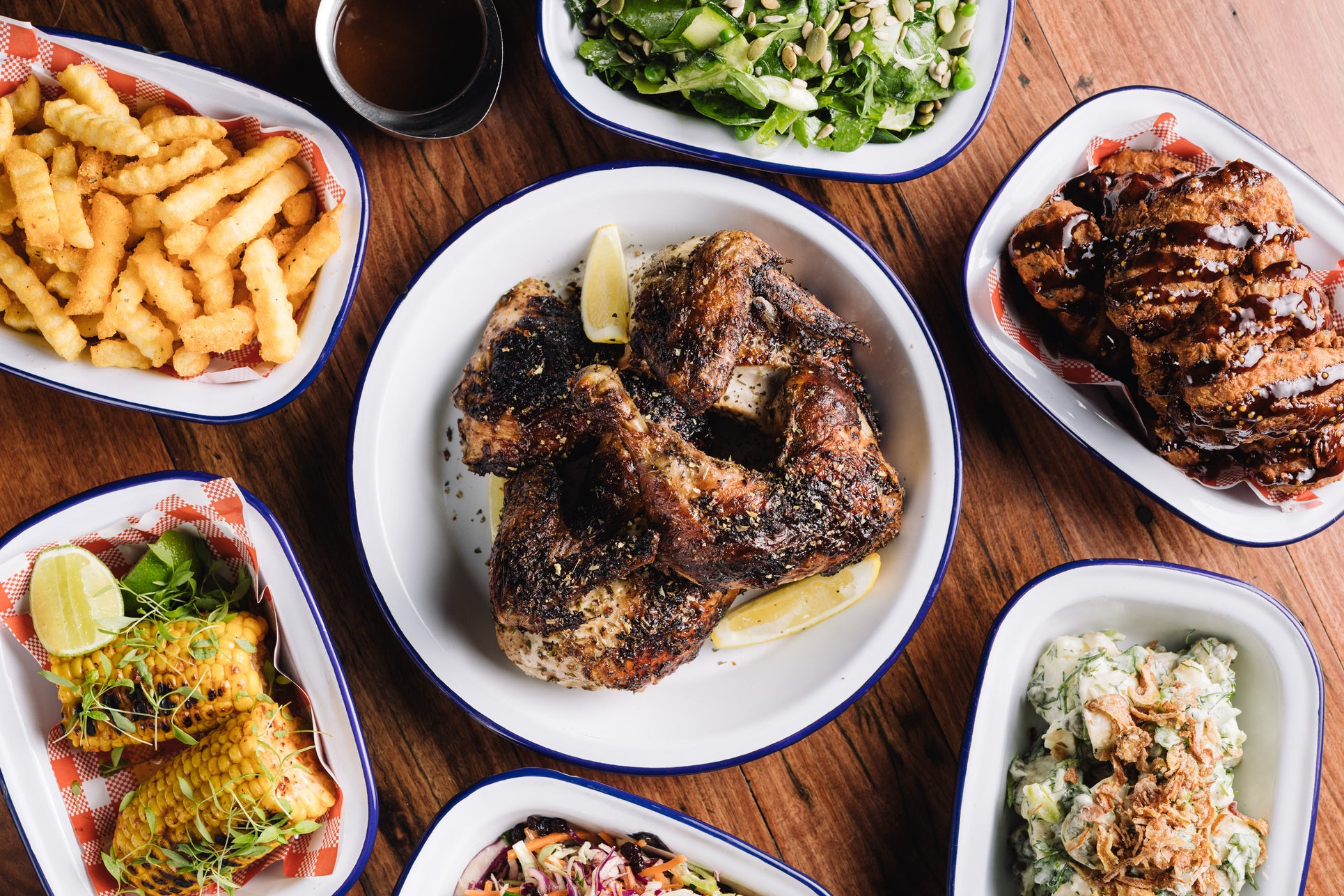Mezzo pollo allevato a terra, 250g di patate rustiche, 1 coca cola per 0.45l€13.00Box pollo per 2