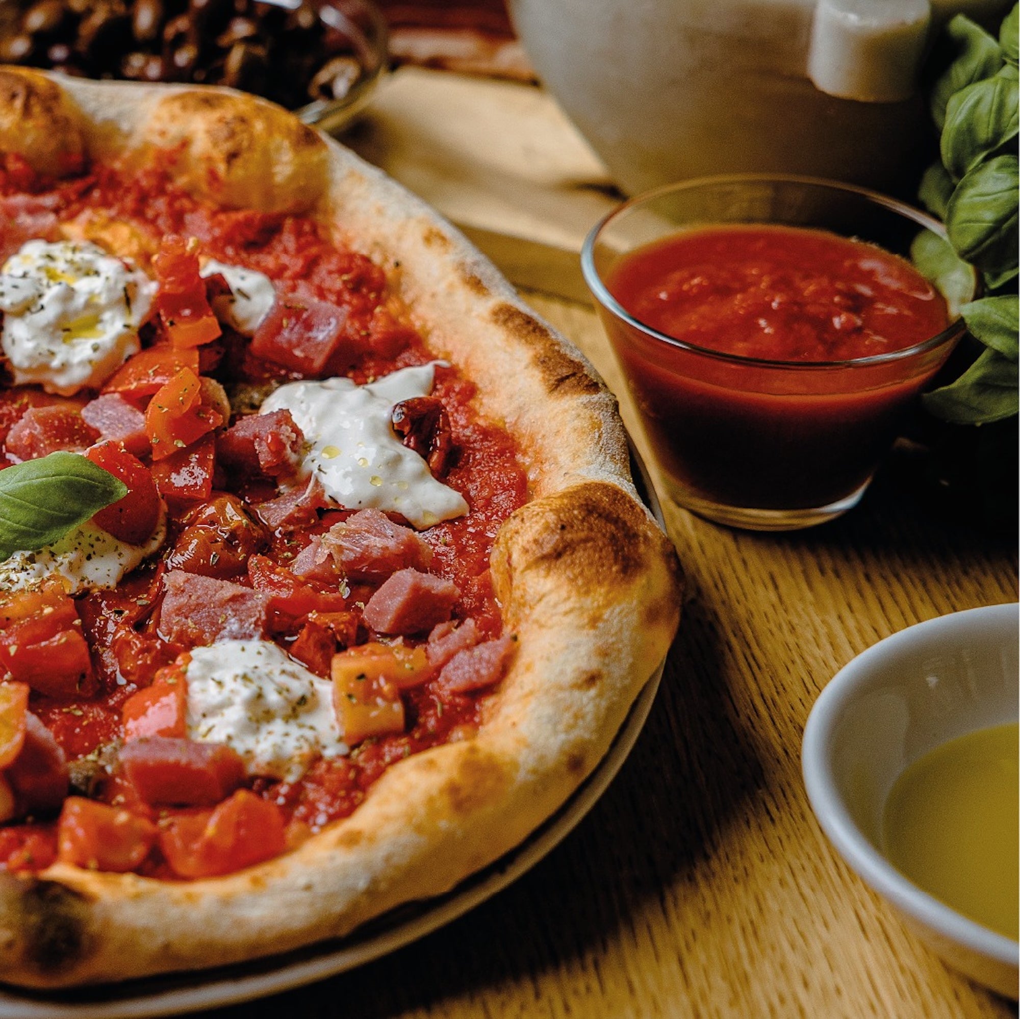 Stracchino, salsa di pomodoro, caciotta e prosciutto cotto€11.50