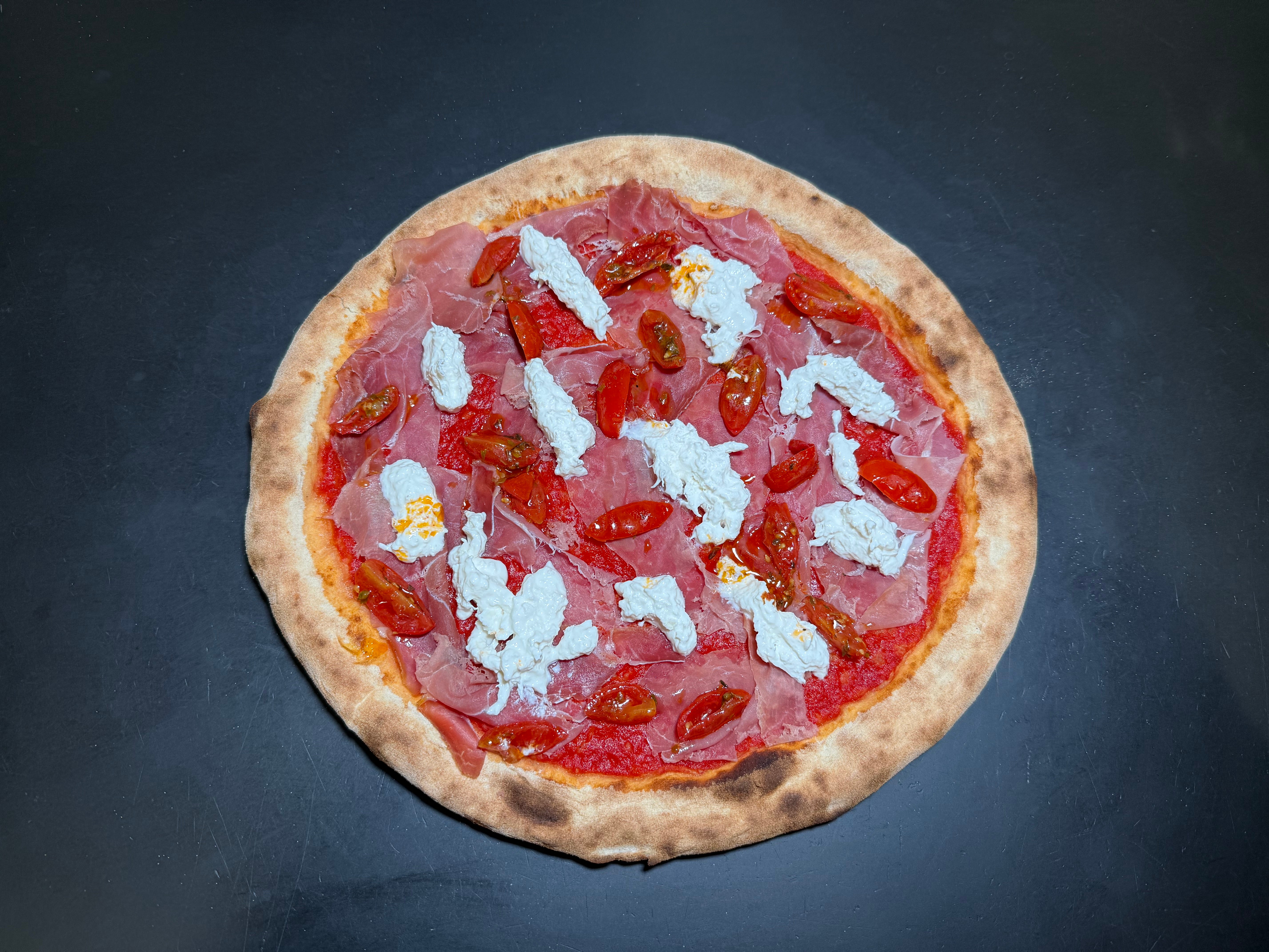 Pomodoro e a fine cottura prosciutto crudo, stracciatella e pomodorini confit€11.00Pizza Romana