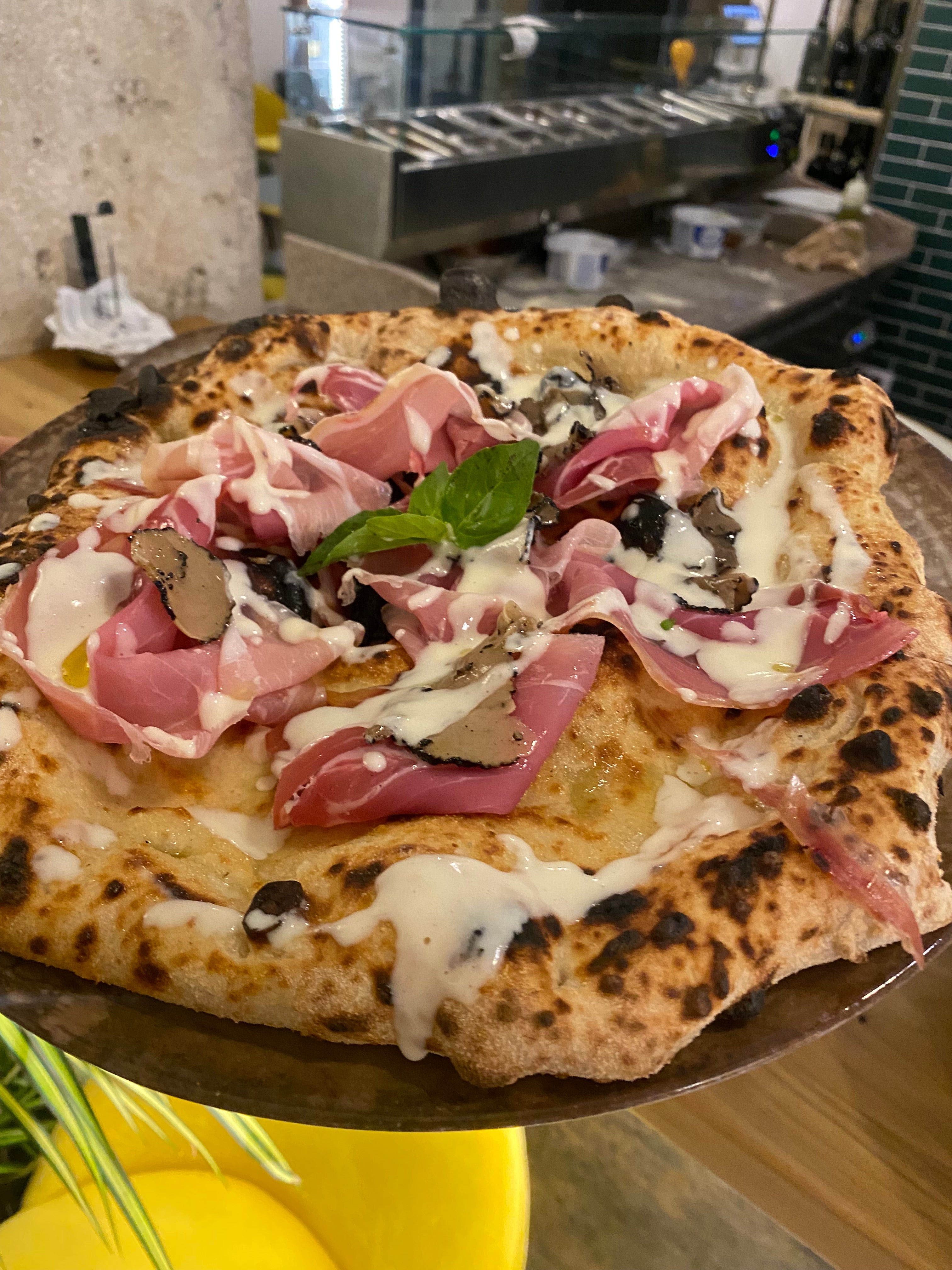 Base focaccia, crema di burrata, prosciutto crudo, tartufo, basilico, olio evo€12.00Plus Margherita