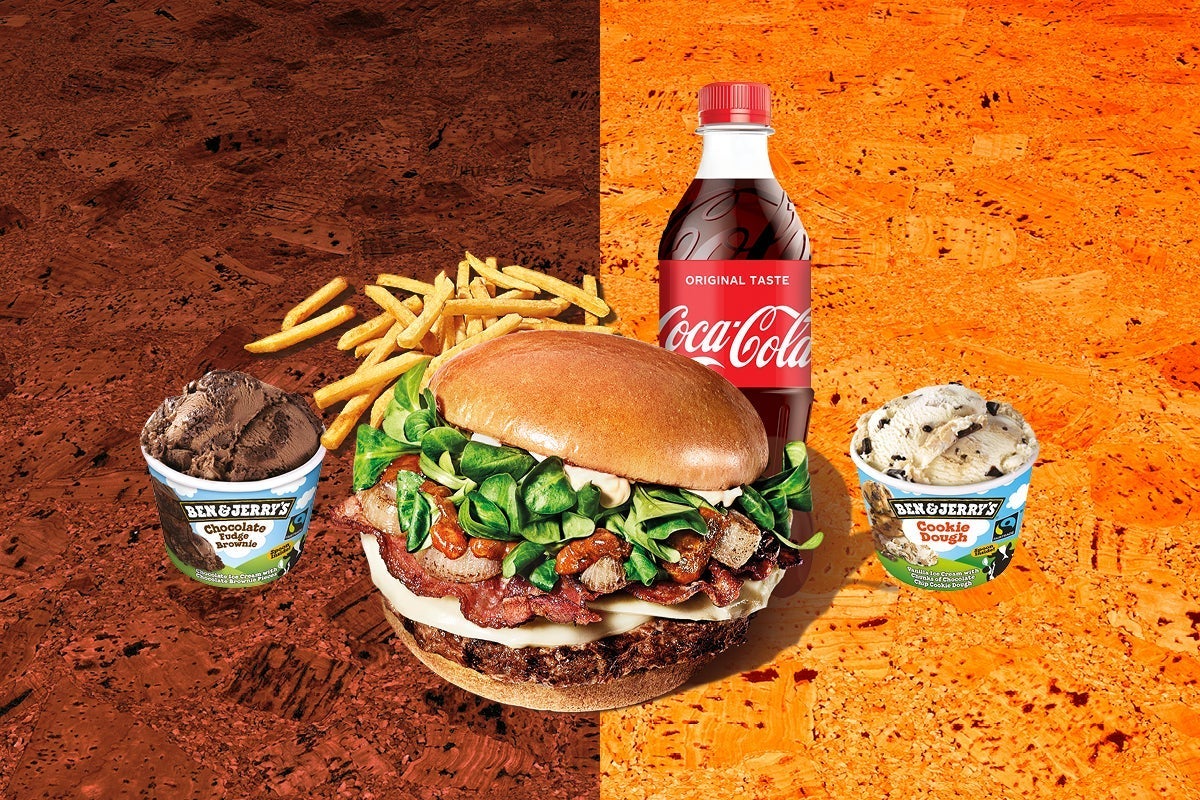 Gusta il Bacon King 3.0 anche Plant-Based, con patty vegetale e sostituto vegetale del bacon! Il patty vegetale è cotto sulla stessa griglia del burger di carne. Il panino contiene maionese da uovo e formaggio fuso da latte. “Le immagini delle bibite inserite sono a scopo puramente illustrativo”€15.40Menu Plant Based SMOKEY BACON KING 3.0