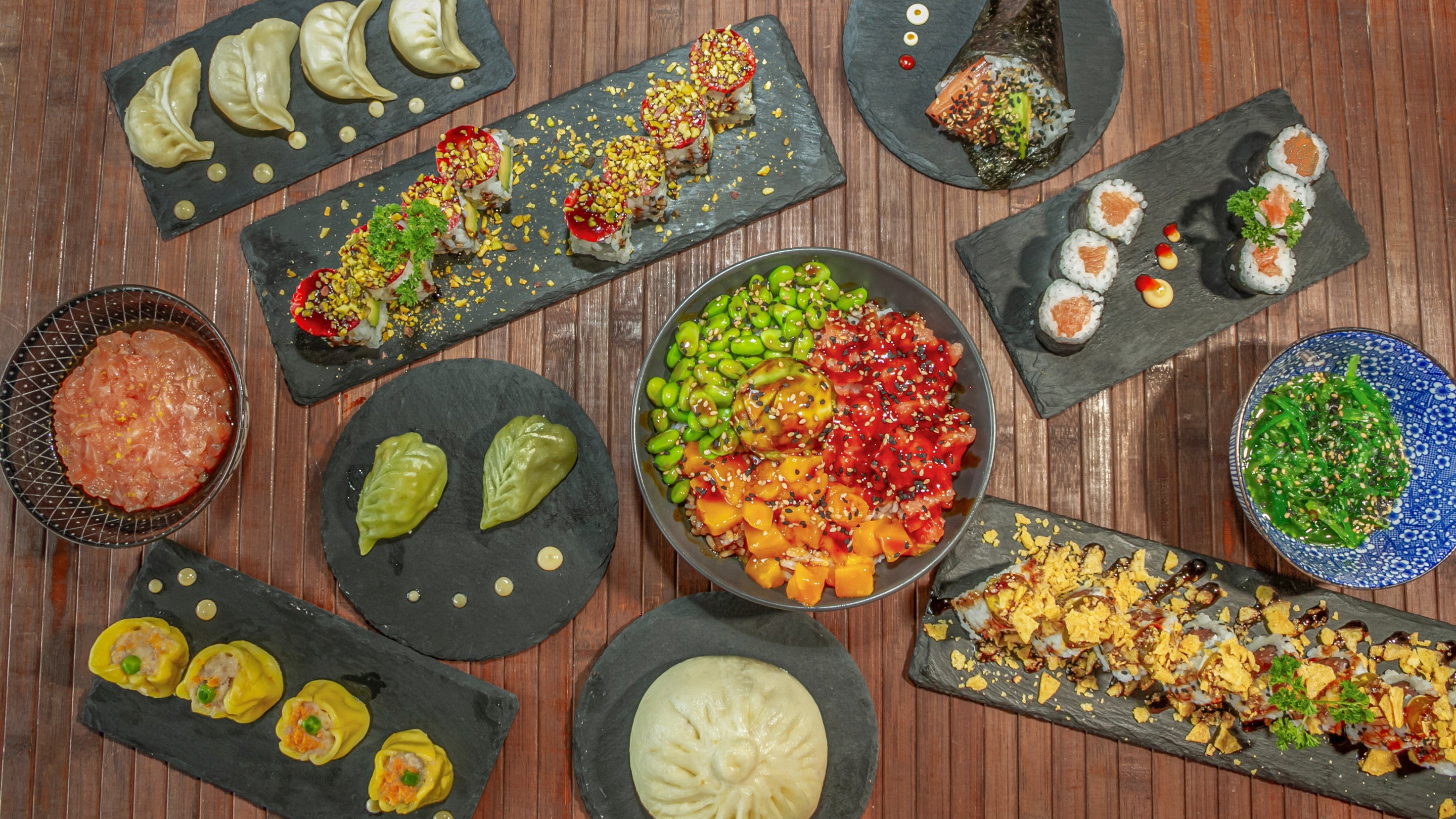 Riso bianco, salmone marinato, salmone cotto, alga wakame, olive, cavolo rosso, guacamole, salsa yogurt e cipolla croccante€17.50