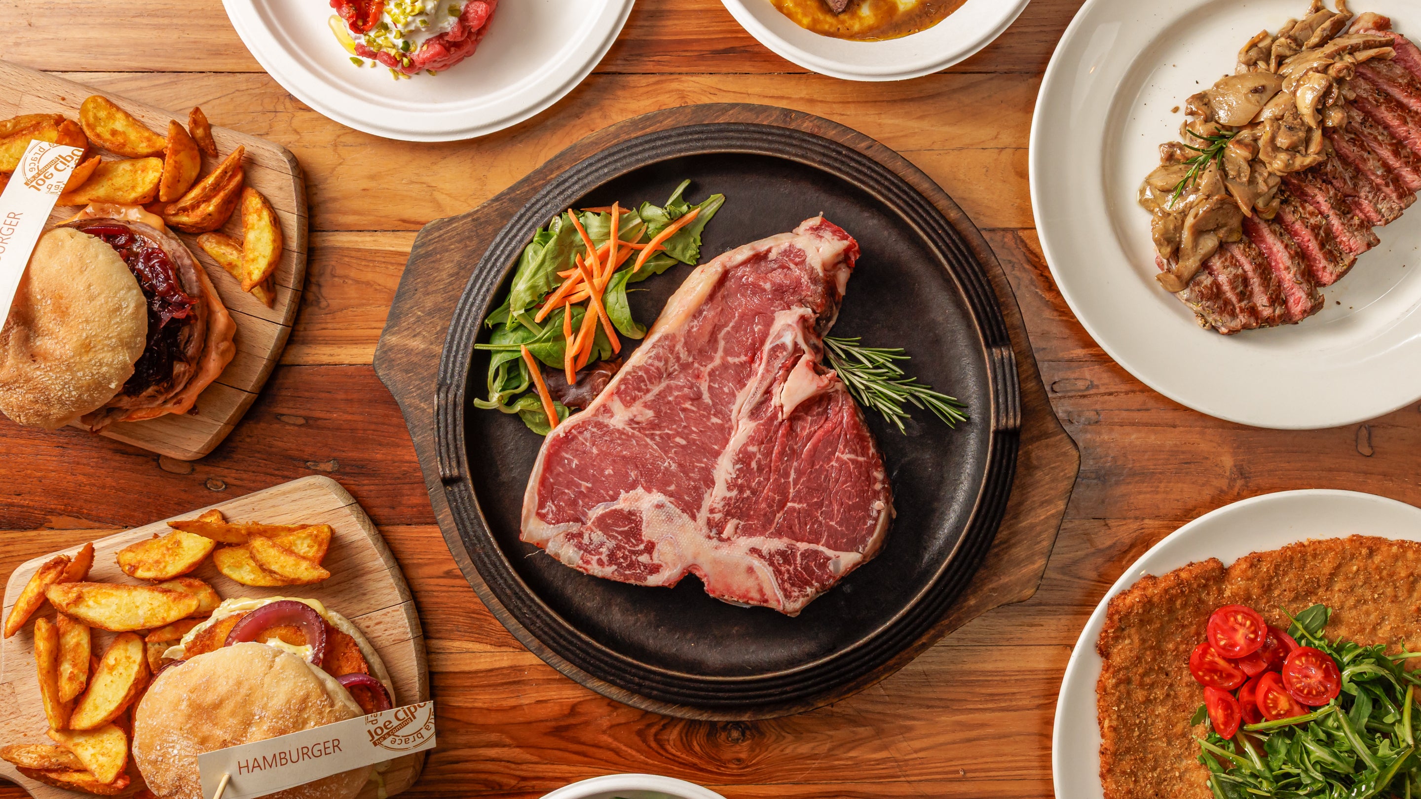 Costata di scottona bavarese extra 500gr servite con patate dorate€29.00Fiorentina di scottona bavarese extra 600gr servite con con patate dorate