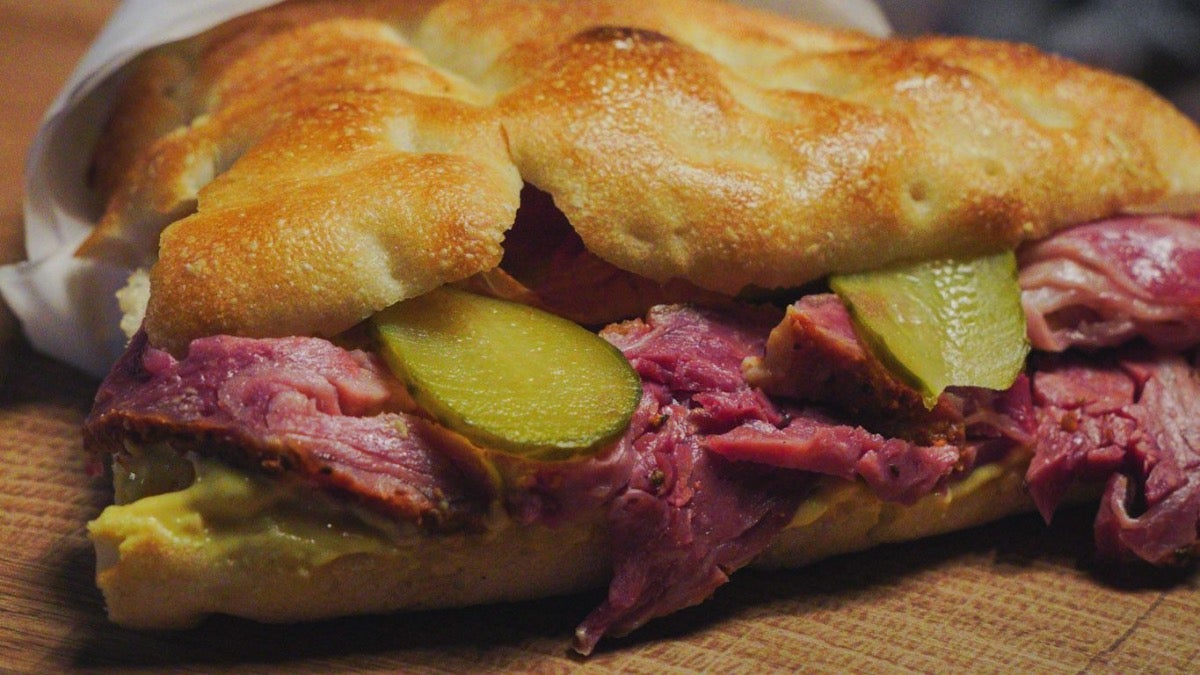 Highly rated· Triangolo di focaccia farcita con pastrami New York style 100g , cetrioli sott'aceto e senape di Dijon€18.50LA GOLOSONA
