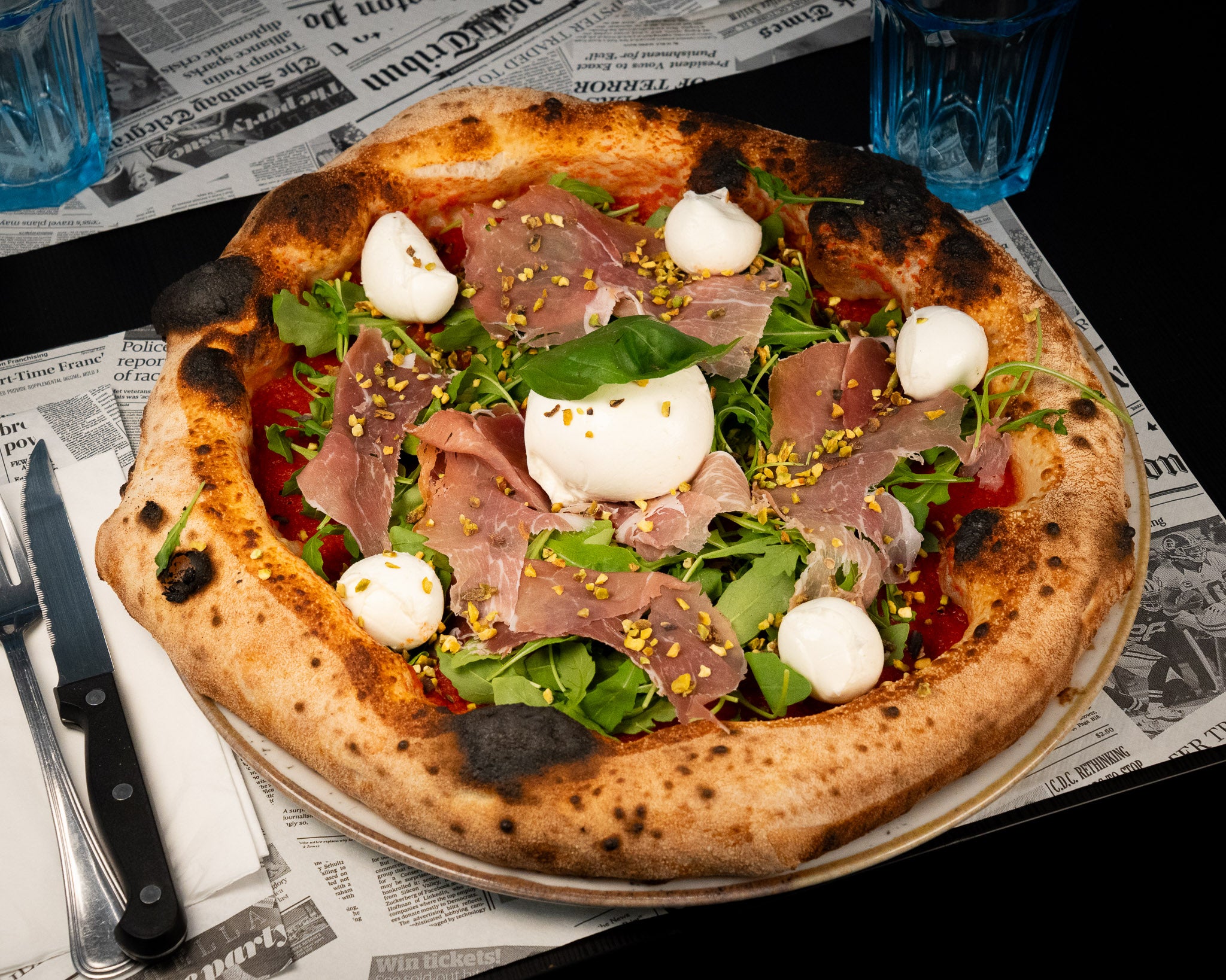 Pomodoro San Marzano DOP, rucola, prosciutto crudo di Parma, burrata pugliese in uscita, granella di pistacchi, olio Evo e basilico€18.00NERANO