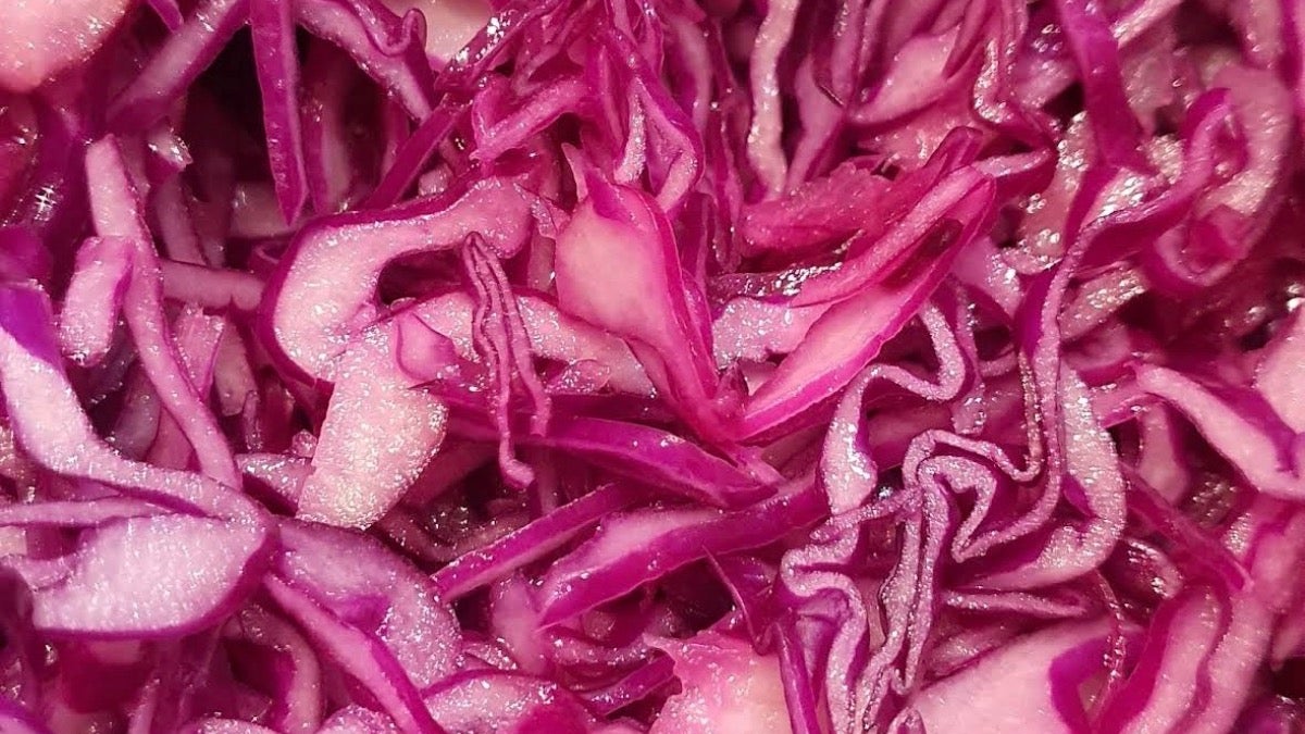 Il kebap è di pollo e la piadina è condita con: insalata, pomodori, cipolle, crauti rossi, mais, salsa yogurt, salsa bianca e piccante.