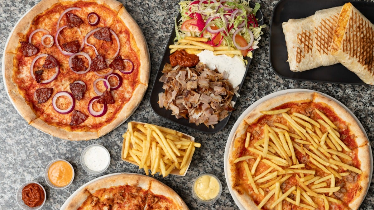 carne kebab,insalata,pomodori,cipolle,cavolo rosso e salsa yougurt e piccante€12.50HalalMenu - Pizza Kebab