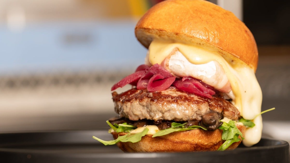 Panino con hamburger di Fassona, Fontina Valdostana, Funghi Cardoncelli e Cicoria.€16.00Komos