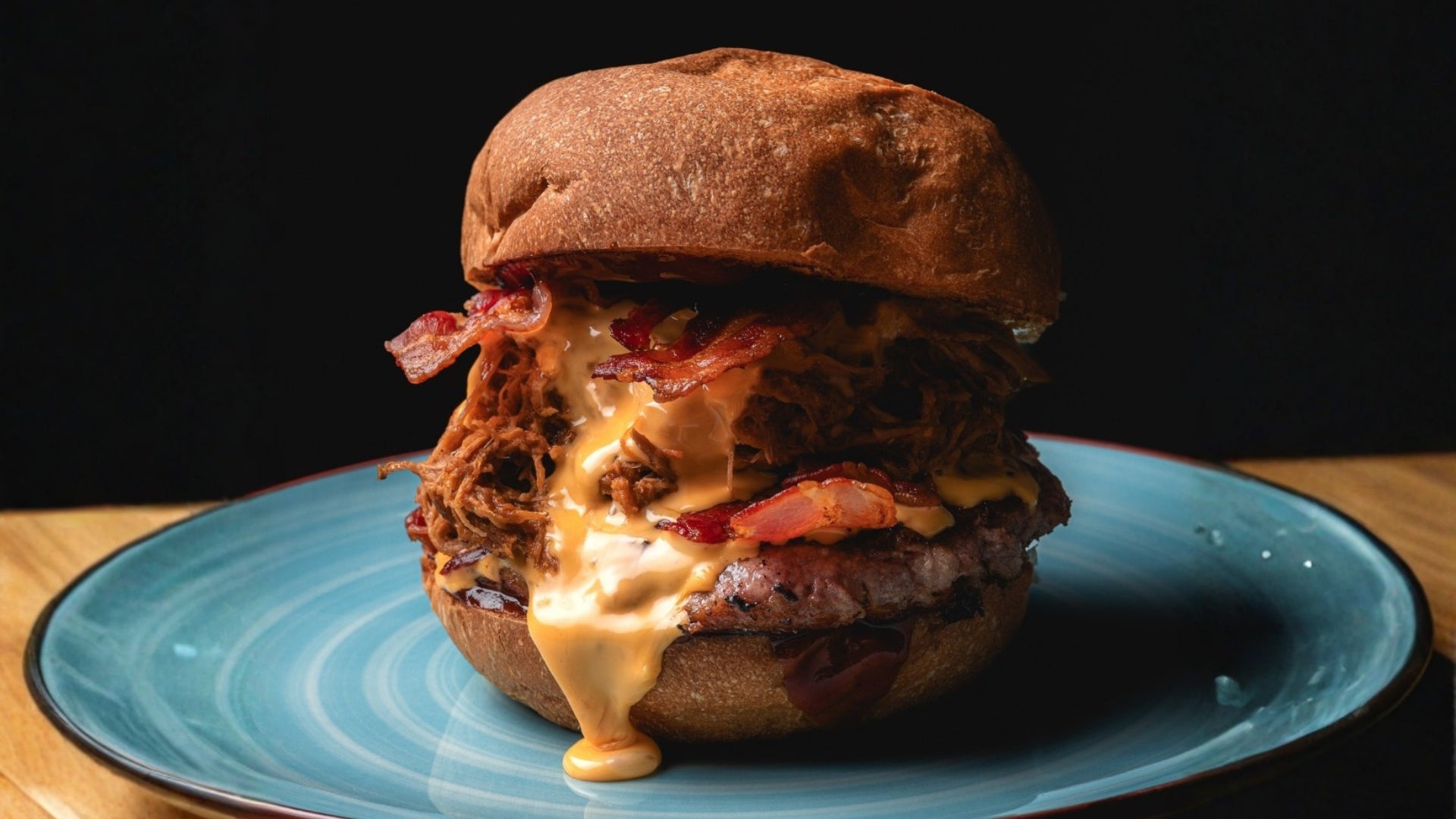 Hamburger 200gr, pulled pork, doppio cheddar fuso, doppio bacon croccante e salsa barbecue