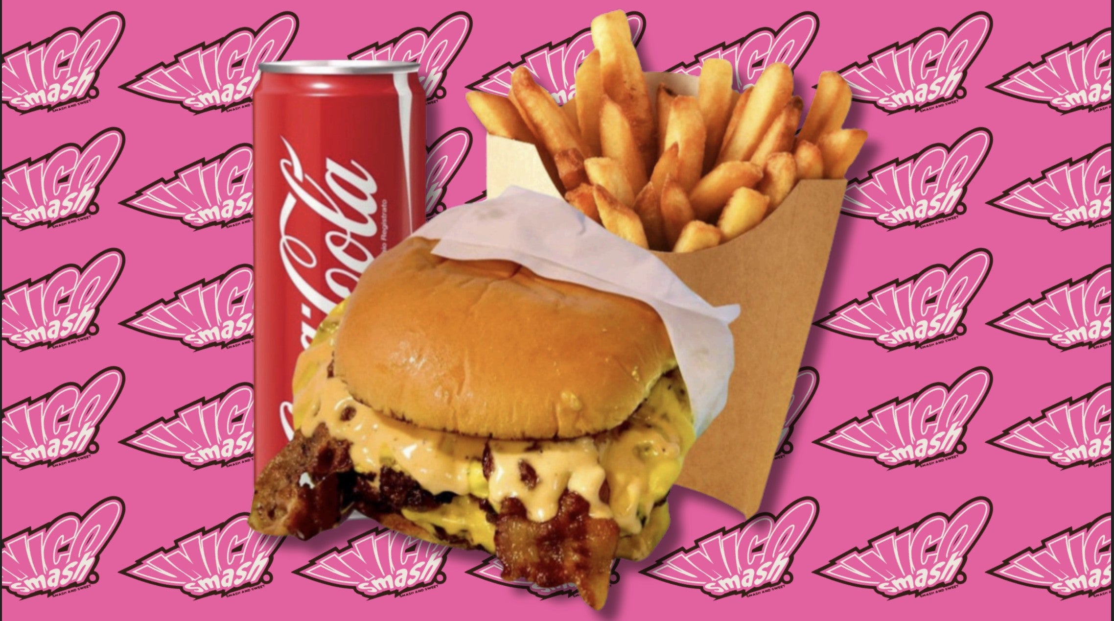 Smash burger, cheddar, crispy bacon, insalata, patatine fritte, salsa sweet chili con patatine e bibita a scelta€12.50SMASHATO 2.0 -MENÙ