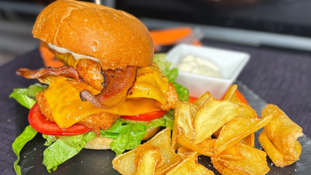 Baconcheeseburger con carne di Angus o Scottona nazionale da 220gr, completo di bacon croccante, UK cheddar, pomodoro, insalata e salsa BBQ home made dello chef, servito su pane caldo home made di farina di grano tenero