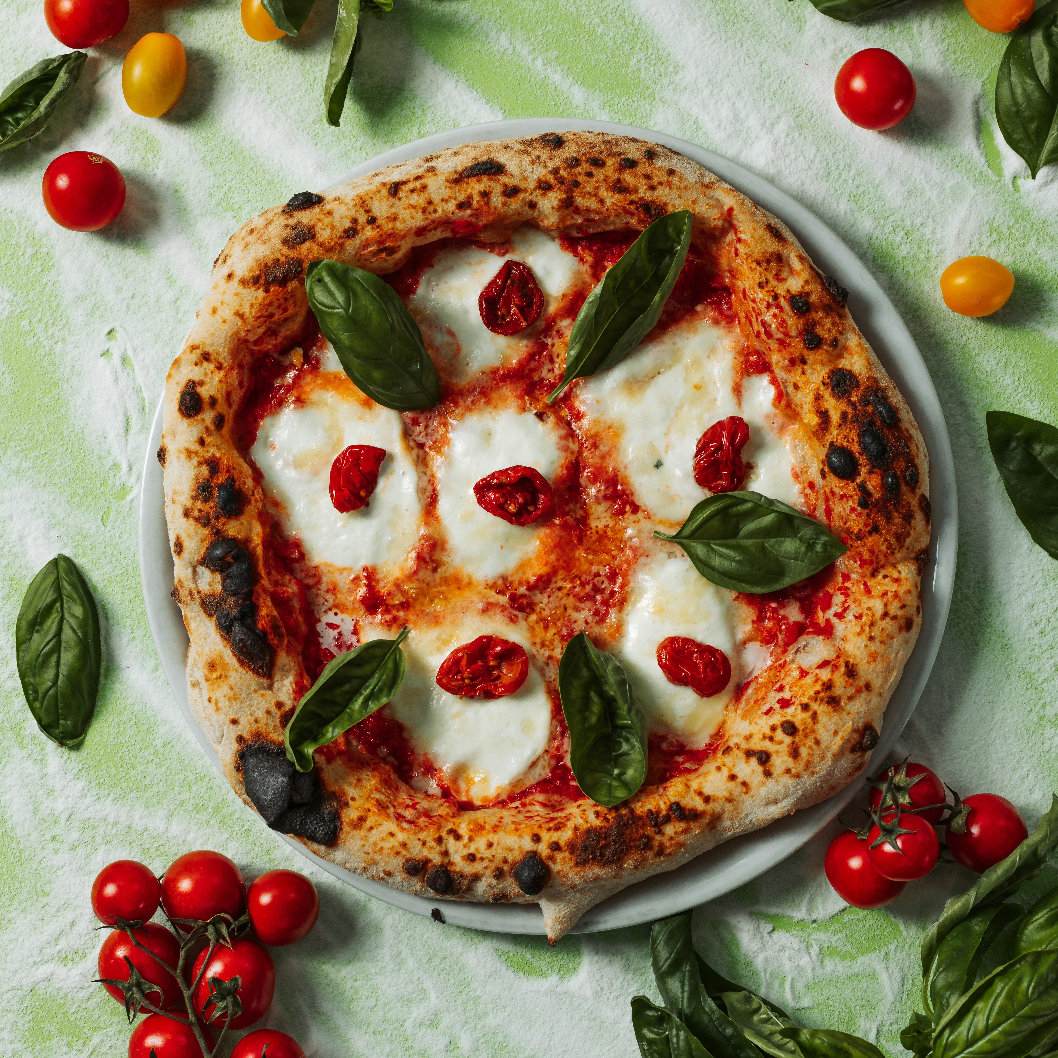 Passata gialla HOMEMADE, stracciatella, melanzane, zucchine e peperoni, basilico, olio EVO.€10.00Margherita Datterina