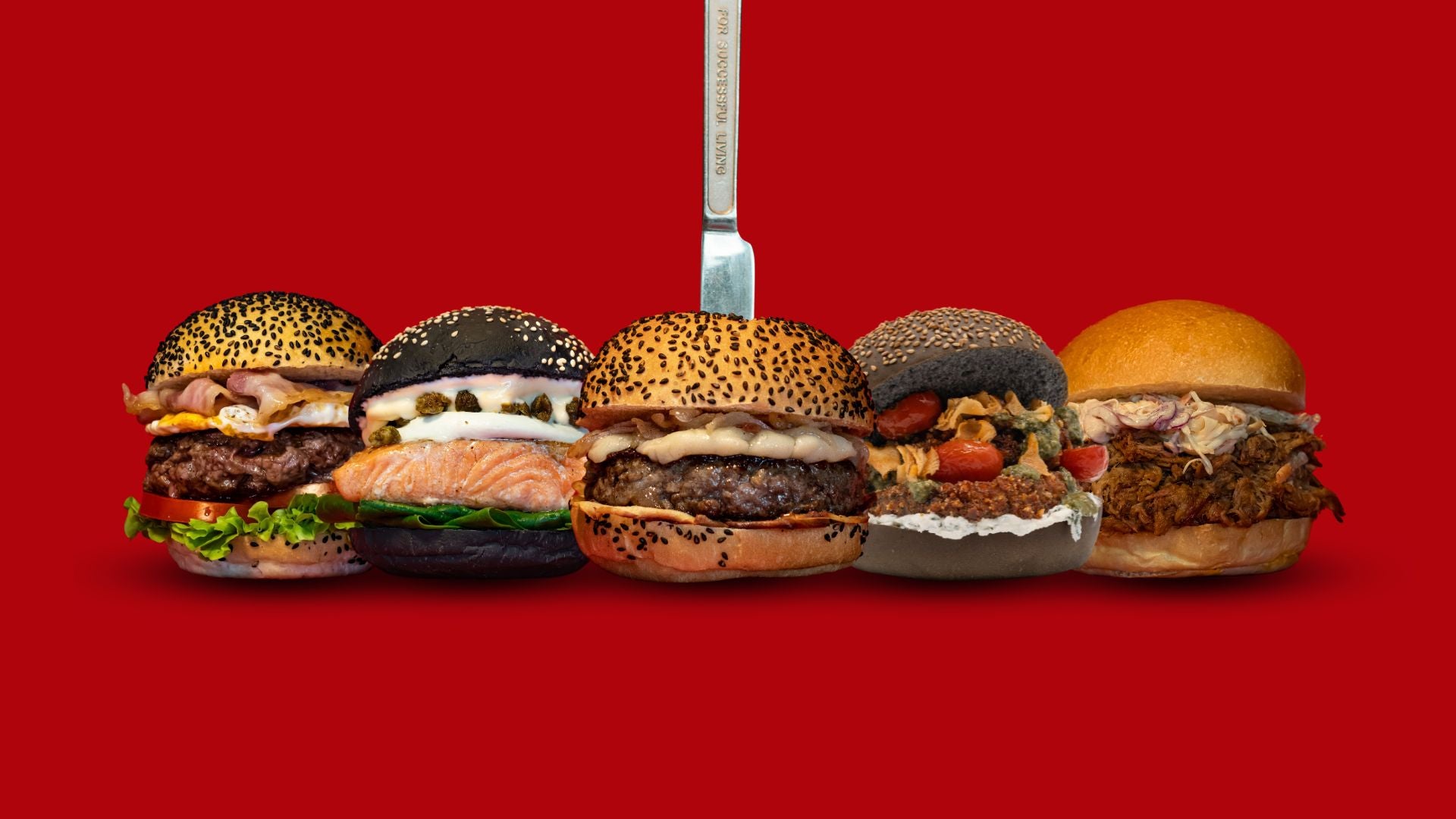 Bun di pane bianco e sesamo nero, carne di manzo, salsa cacio e pepe, guanciale croccante e mela essiccata al forno.