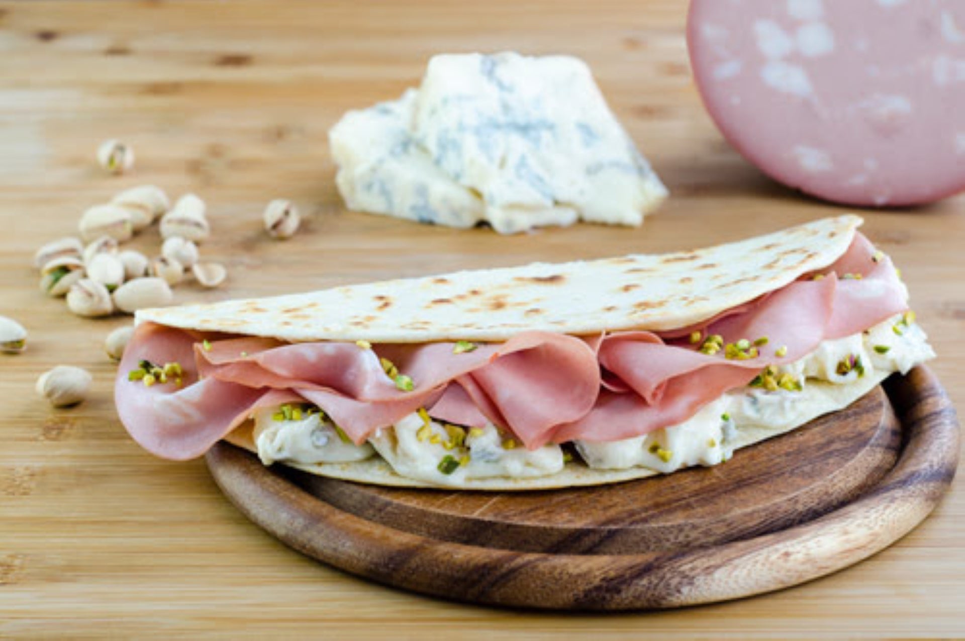 €8.50Piadina con salmone norvegese affumicato, stracciatella pugliese, granella di pistacchio, songino