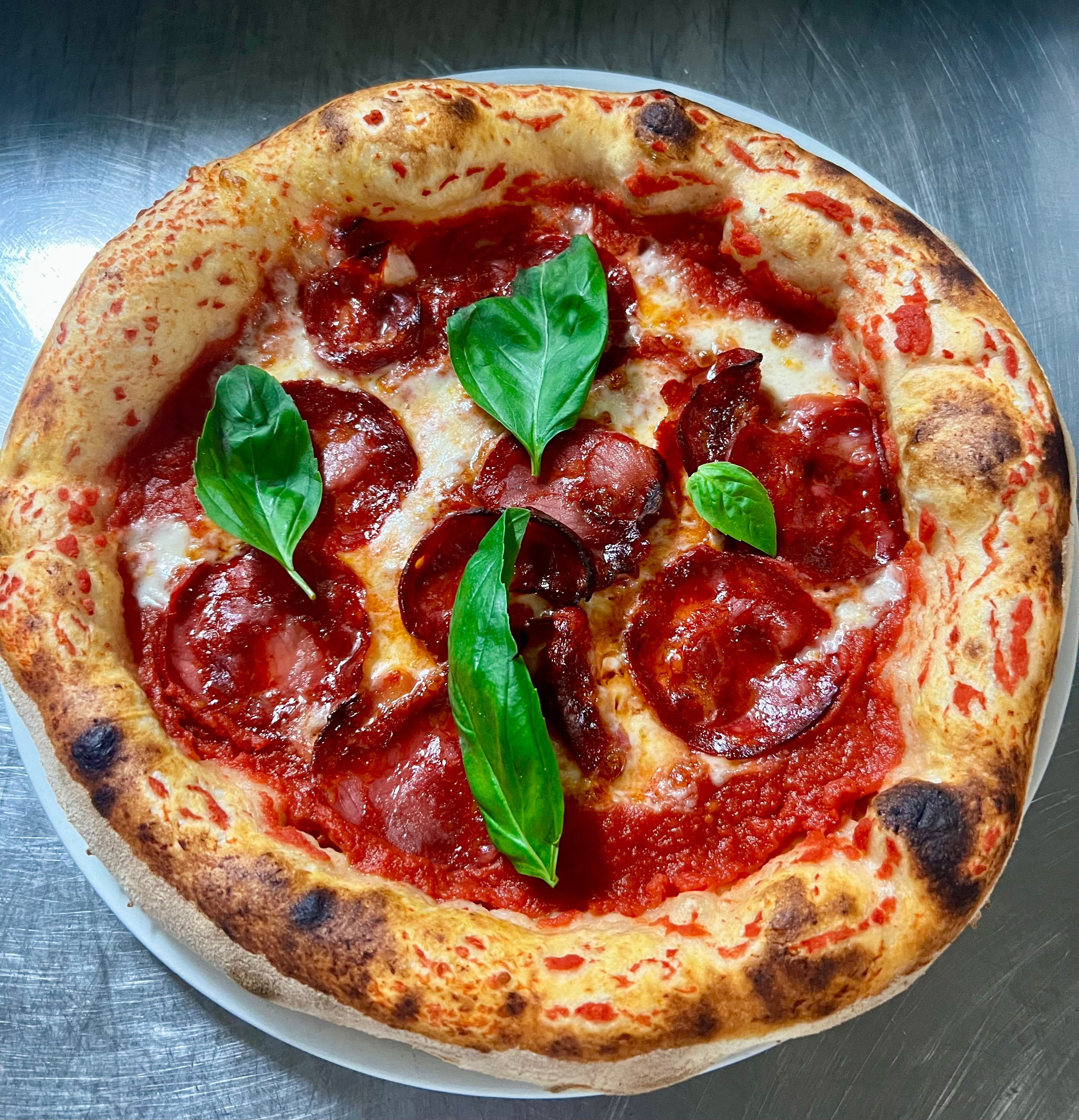 La pizza al pistacchio è un piatto gourmet che unisce la croccantezza della base con il sapore ricco e tostato del pistacchio. Il condimento, semplice ma raffinato, prevede una crema di pistacchio spalmata sulla pizza, che arricchisce ogni morso con un gusto pieno e avvolgente. Per un tocco finale, il tutto viene completato con un filo di olio extravergine d'oliva e una leggera spolverata di pistacchi tritati, per un'esperienza unica che esalta la ricchezza di questo ingrediente.€7.50Margherita