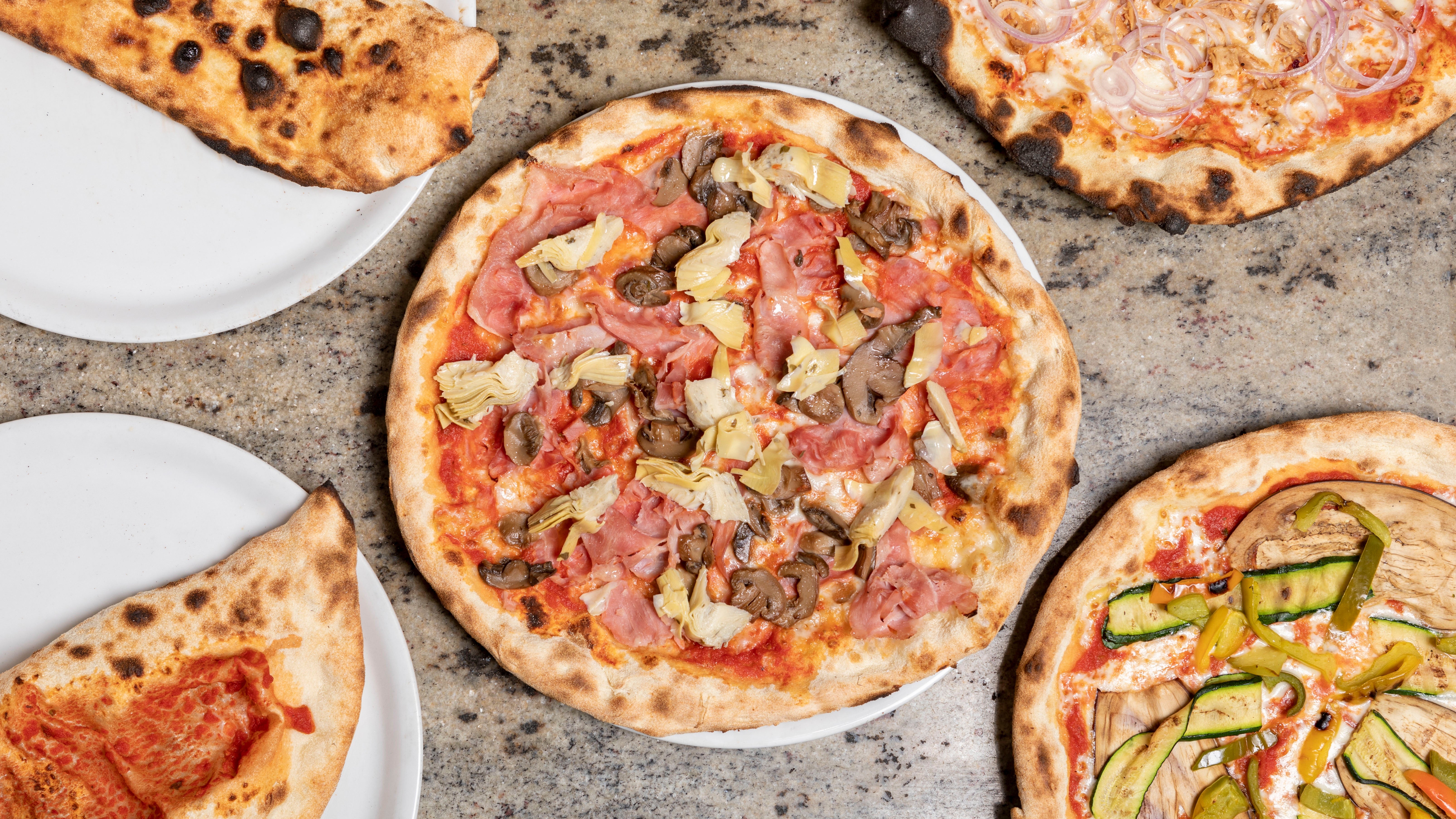 Pomodoro, mozzarella, ricotta, spinaci€7.20Capricciosa
