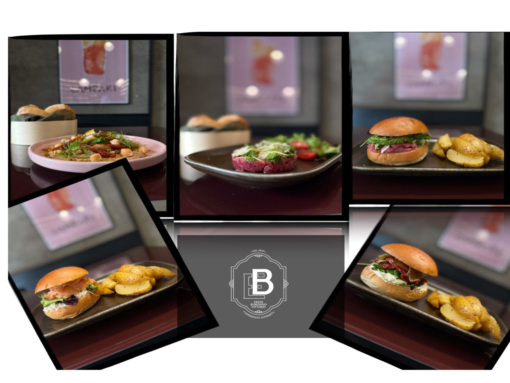 Burger con zucchine alla scapece, stracciatella, pomodoro secco e patate al forno€15.00