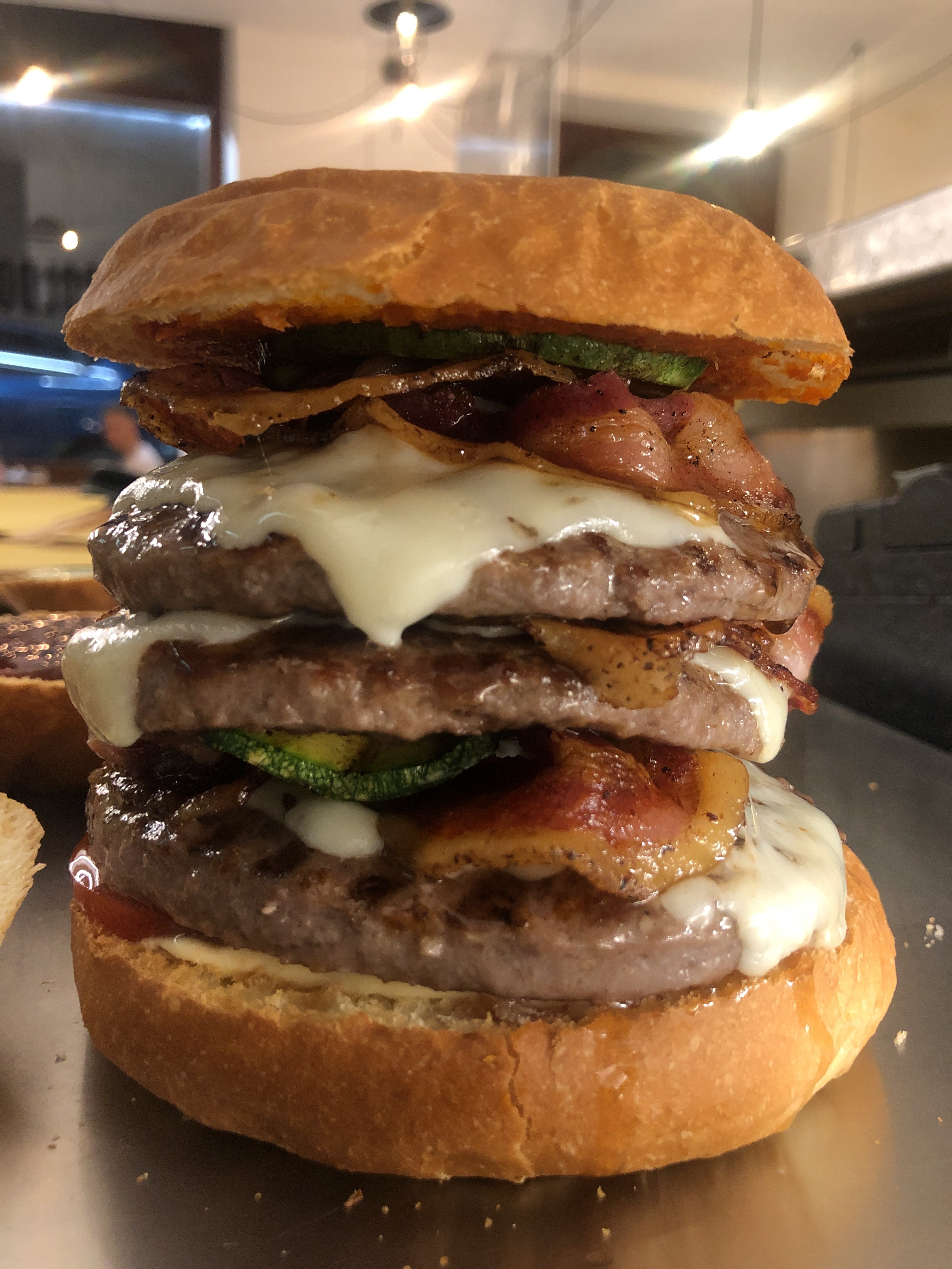 Doppio hamburger di 130gr di manzo, peperoni e cipolla grigliata, ormaggio, salsa habanero, maionese e una porzione di patatine fritte