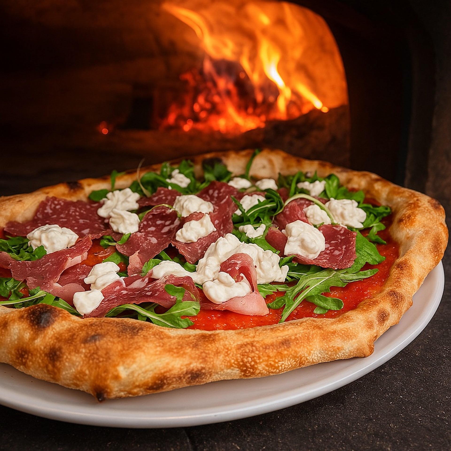 Pomodori, provola affumicata di fiordilatte, rucola, carpaccio di angus e grana padano a scaglie10,00 €Diavola - normale