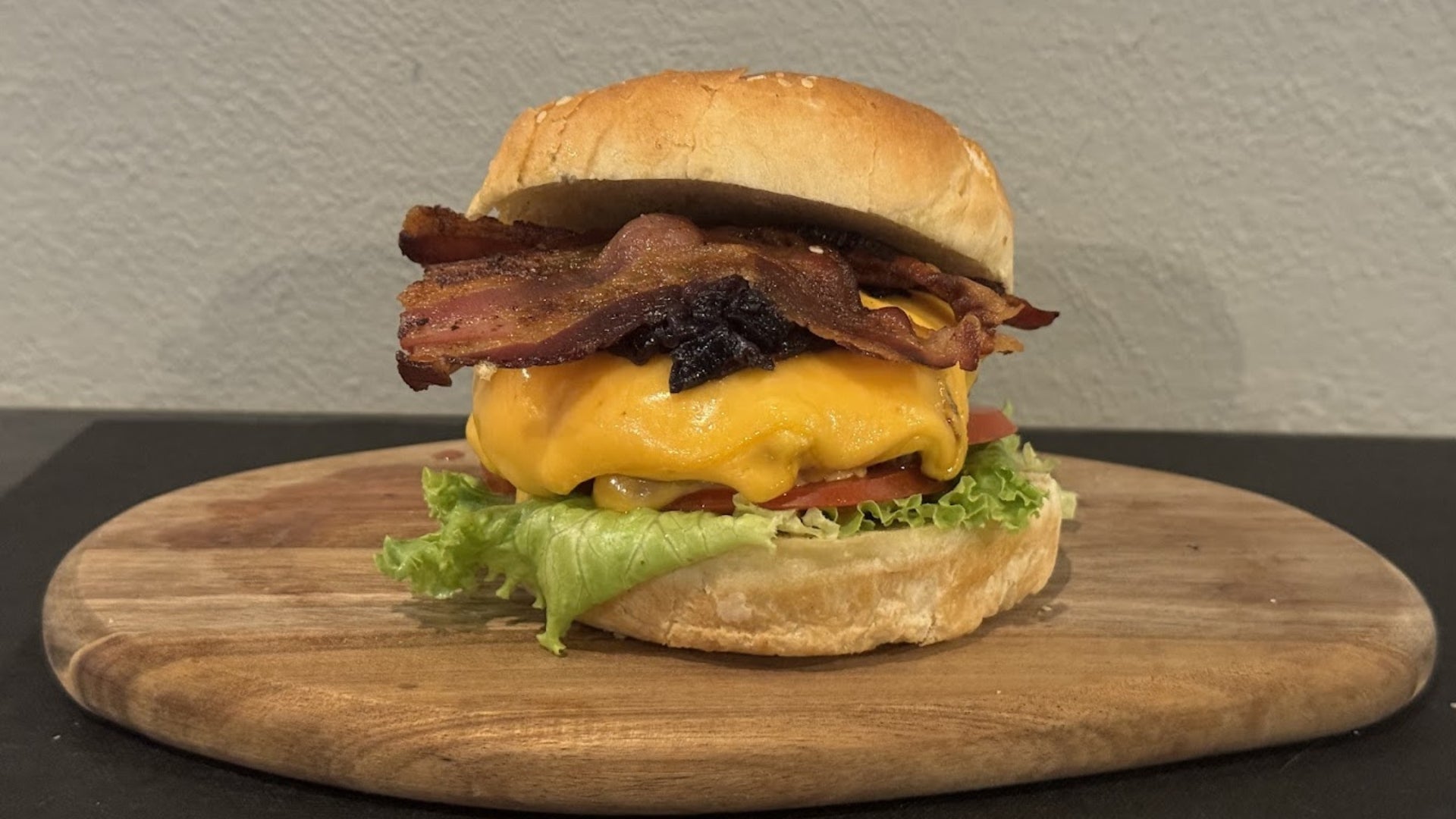 Burger di bovino, cheddar x6, bacon croccante, cipolla caramellata. Accompagnato dalle nostre patate fritte a cui è possibile aggiungere una salsa.