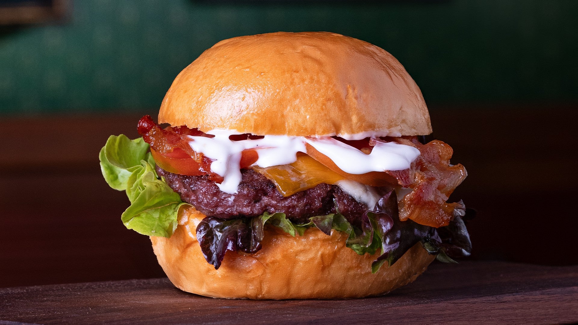 Bun brioche*, doppio hamburger di manzo, doppio bacon, insalata, pomodoro, maionese, doppio formaggio edamer e cheddar.