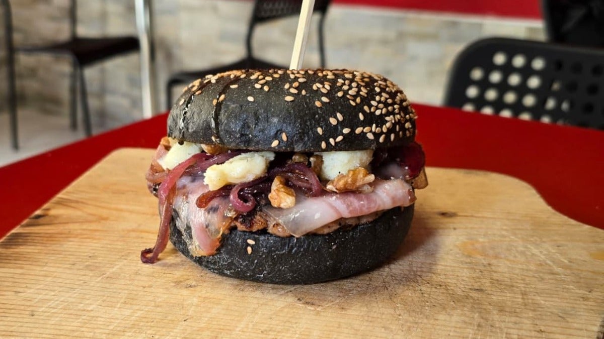 Ottime recensioni· Panino BLACK con semi di sesamo, Rucola, Hamburger 100% sardo, gorgonzola, noci e maionese.11,90 €Porky Pink