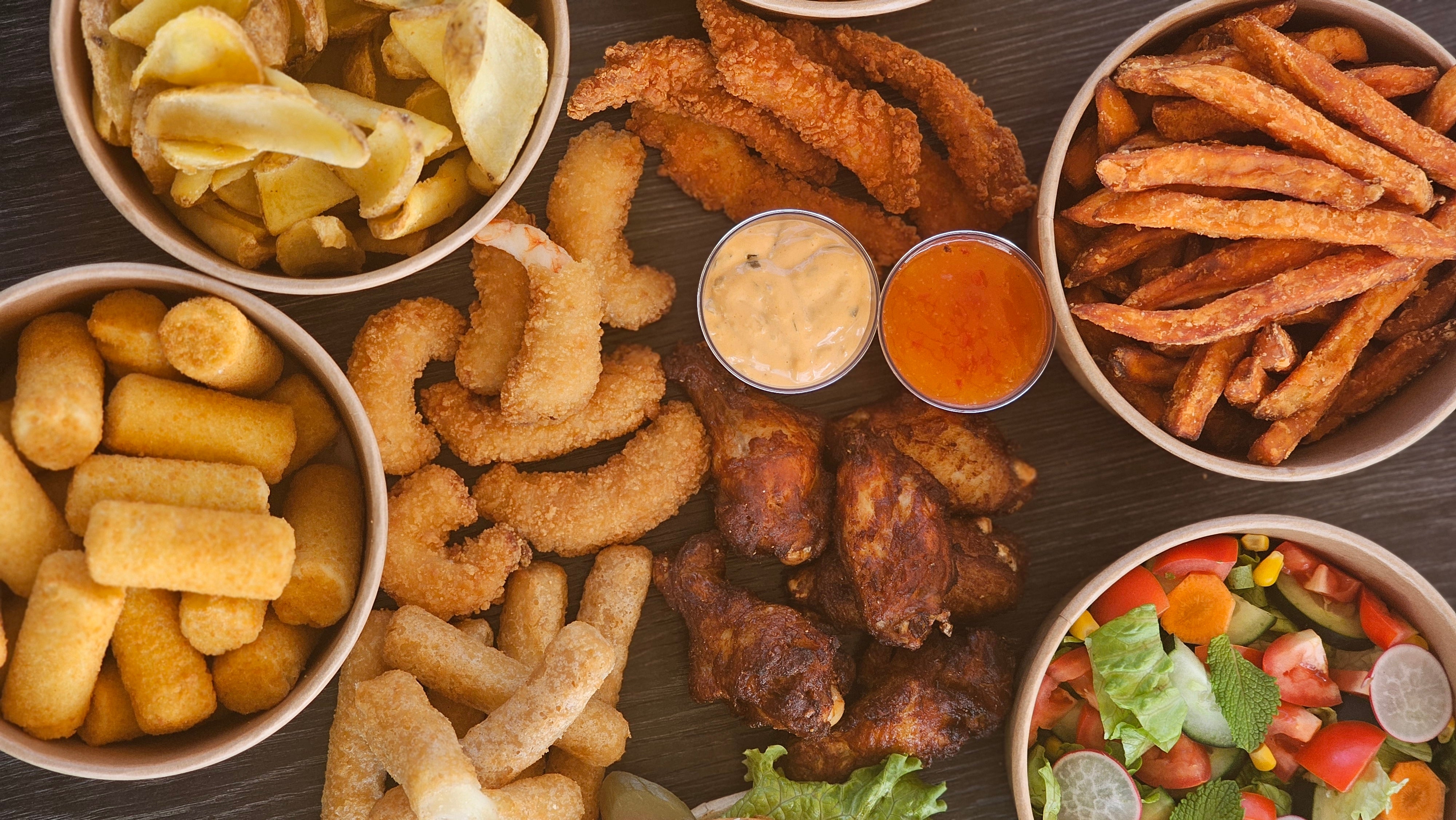 6 alette di pollo, patate, salsa, insalata di cavolo con bevanda12,90 €Finger food