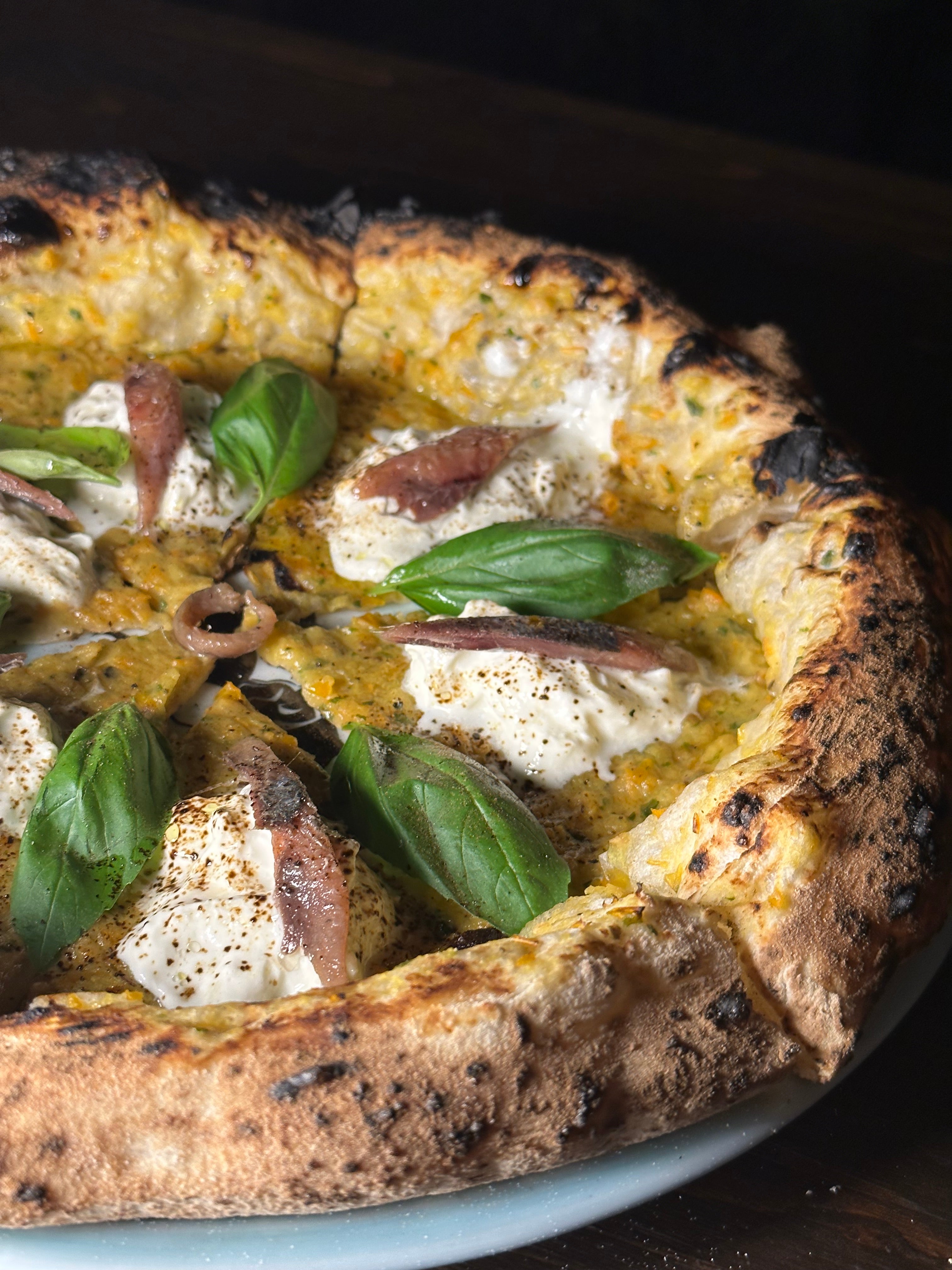 Crema di ricotta e broccoli, salsiccia secca locale, fior di latte, basilico, olio EVO.12,00 €Capicollo