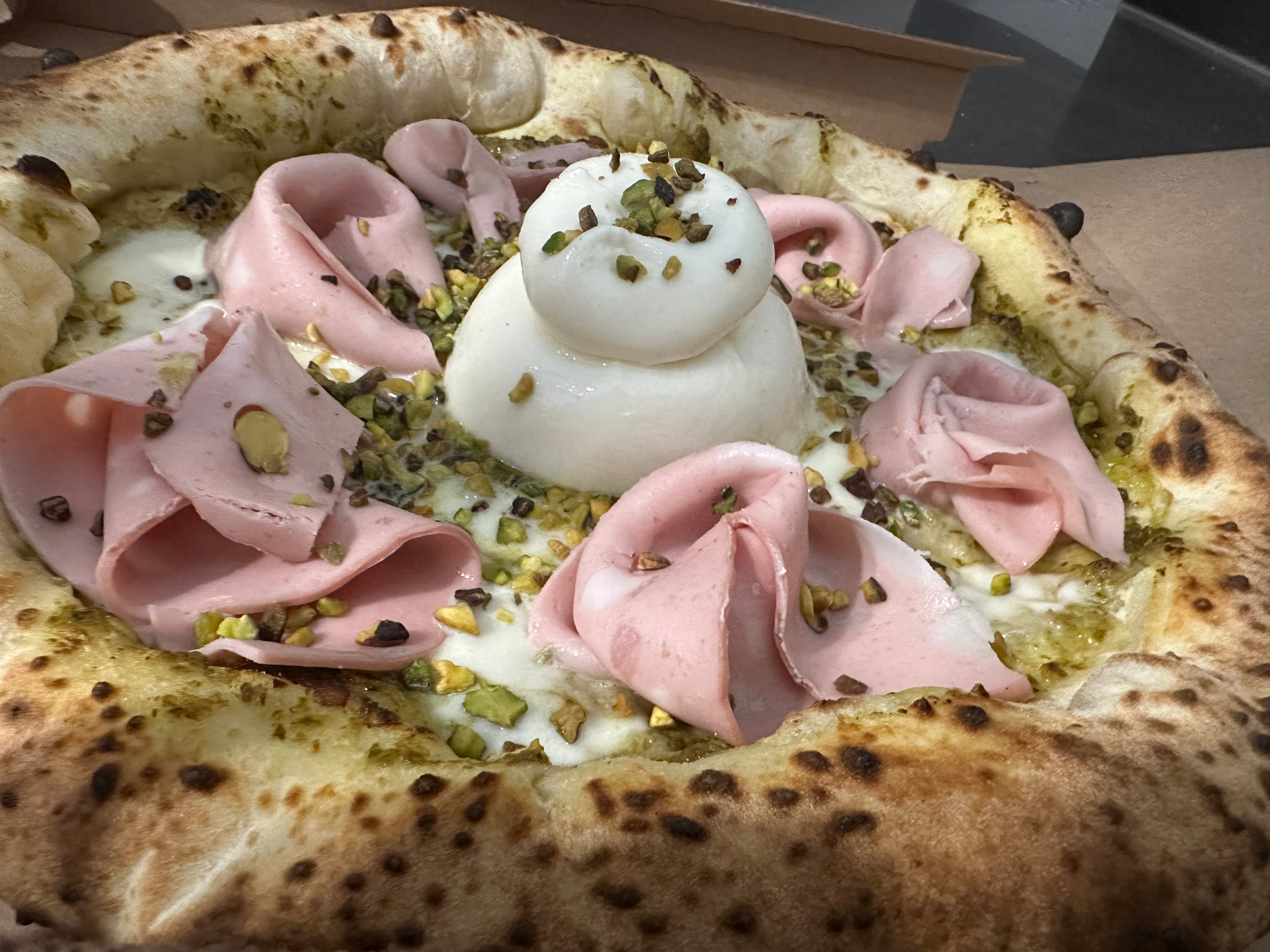Mozzarella Fiordilatte, pomodorini, granella di pistacchio, rucola, rondelle di Mortadella e burrata fritta con mortadella e pistacchi.