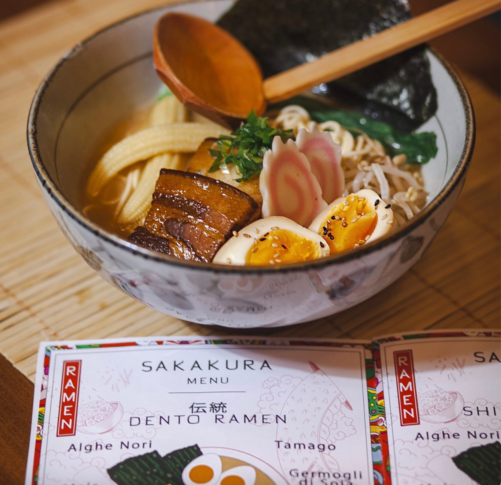 Brodo di crostacei e pesce bianco, con gamberi ,salmone, calamaro scottato, naruto, alghe wakame, ikura, alghe nori, negi18,00 €Dento ramen