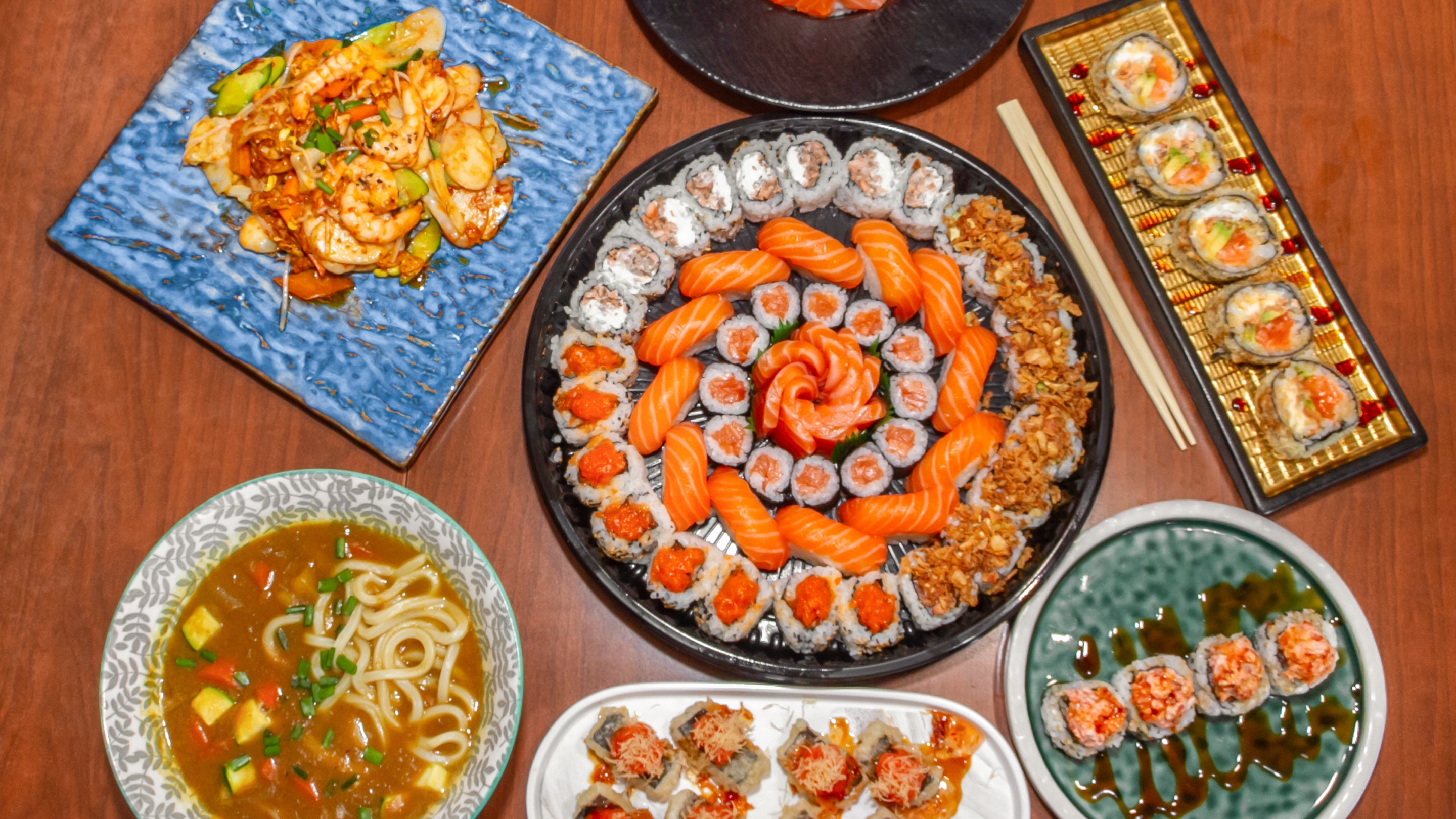 8 uramaki tiger, 8 uramaki chef crudo, 8 uramaki chef speciale, 8 gunkan misto, 6 nigiri speciali, 8 hosomaki sake, una porzione di tartare di salmone, una porzione di tartare di tonno, 5 fette di sashimi sake e una bottiglia di prosecco100,00 €