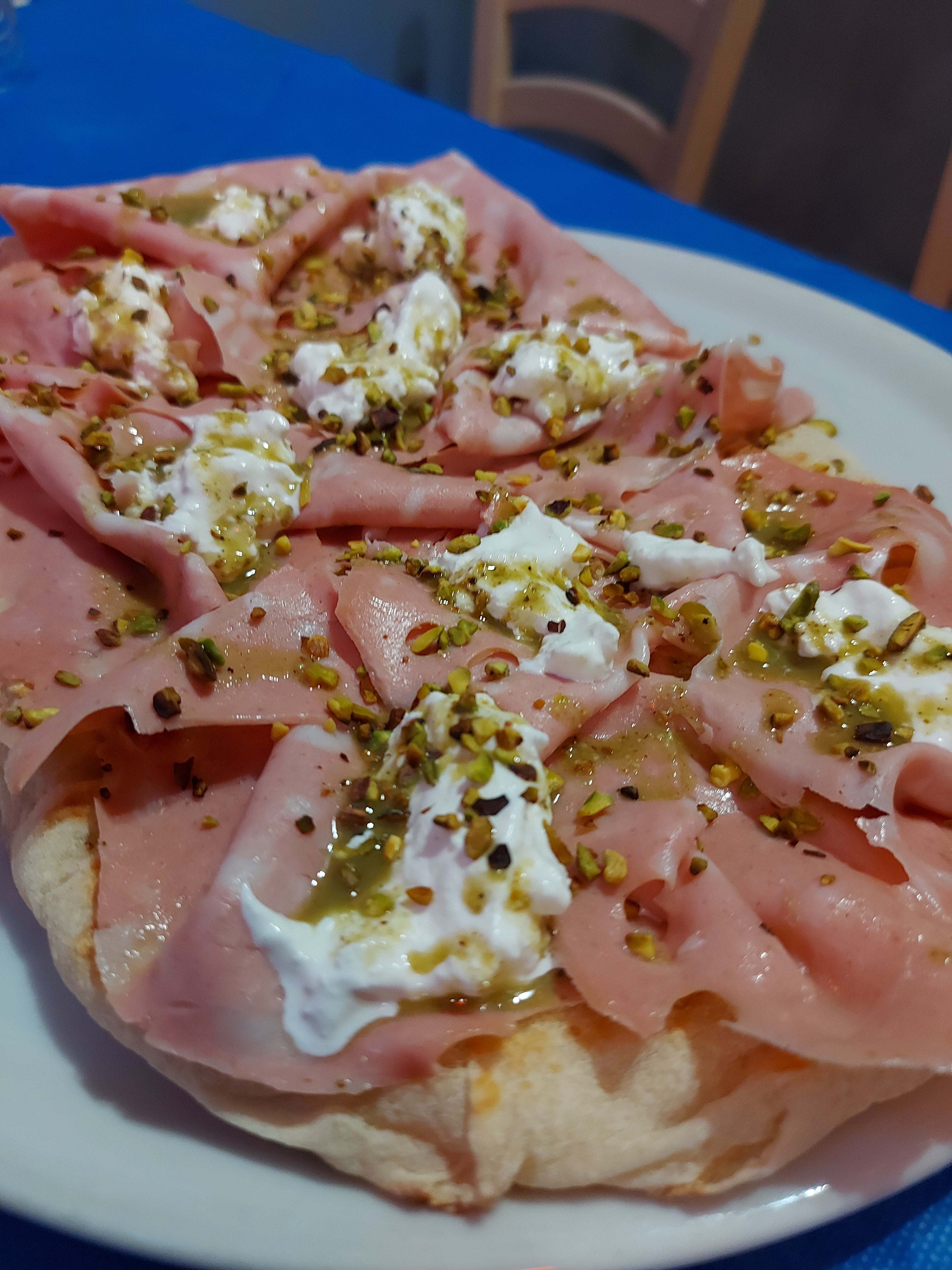 Crema di pistacchio, mortadella, granella di pistacchio, mozzarella.