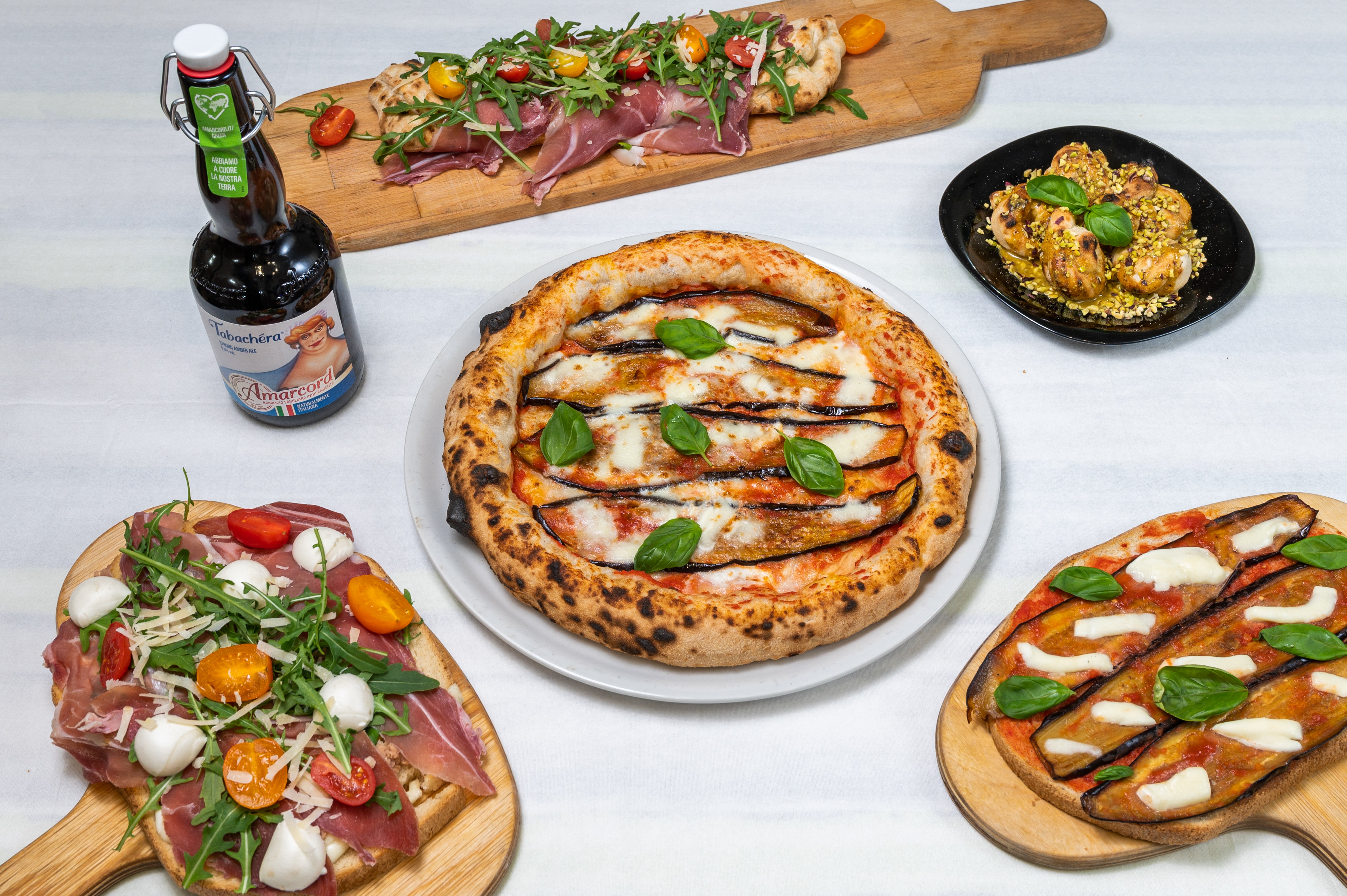 Mortadella e pistacchio; pancetta, provola e fonduta di pecorino romano dop; prosciutto crudo, rucola, pomodorini e scaglie di grana