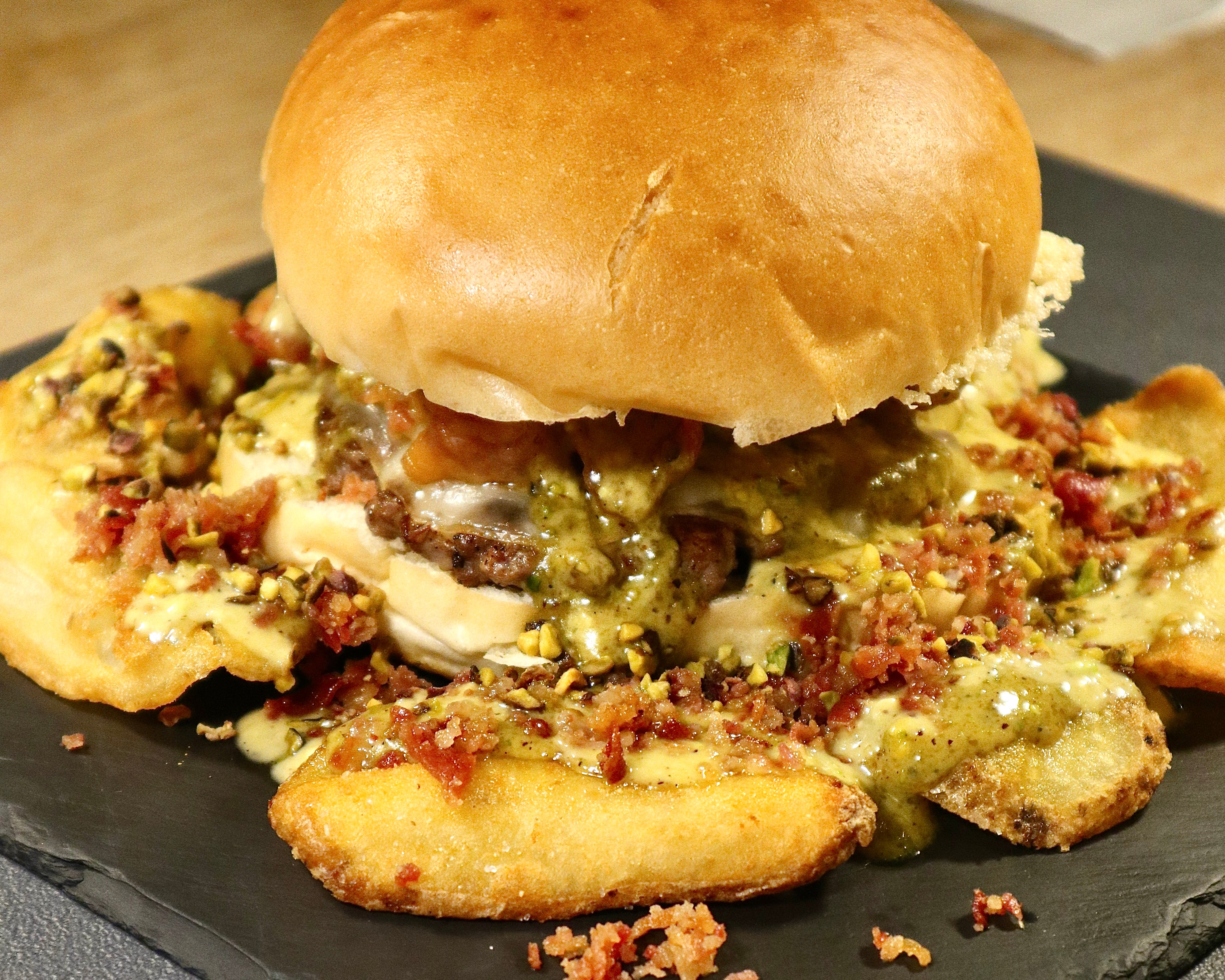 Bun artigianale, burger di scottona 150 gr, pomodorino scattato,fonduta di scamorza affumicata, bacon crispy, iceberg, maionese patatine dippers.12,50 €Bronte