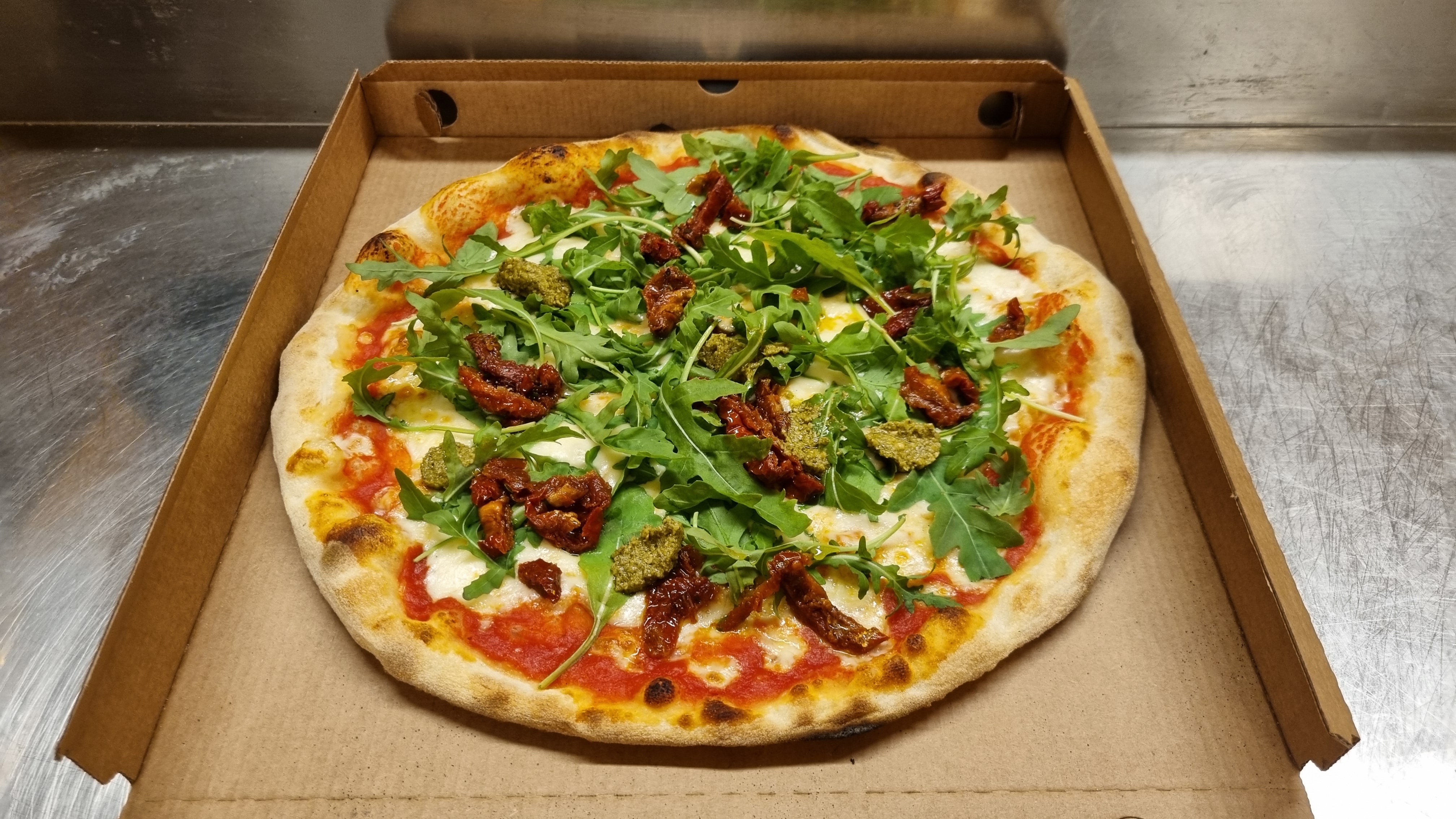 Pomodoro, mozzarella fiordilatte, salame piccante, pomodoro secco, ricotta affumicata