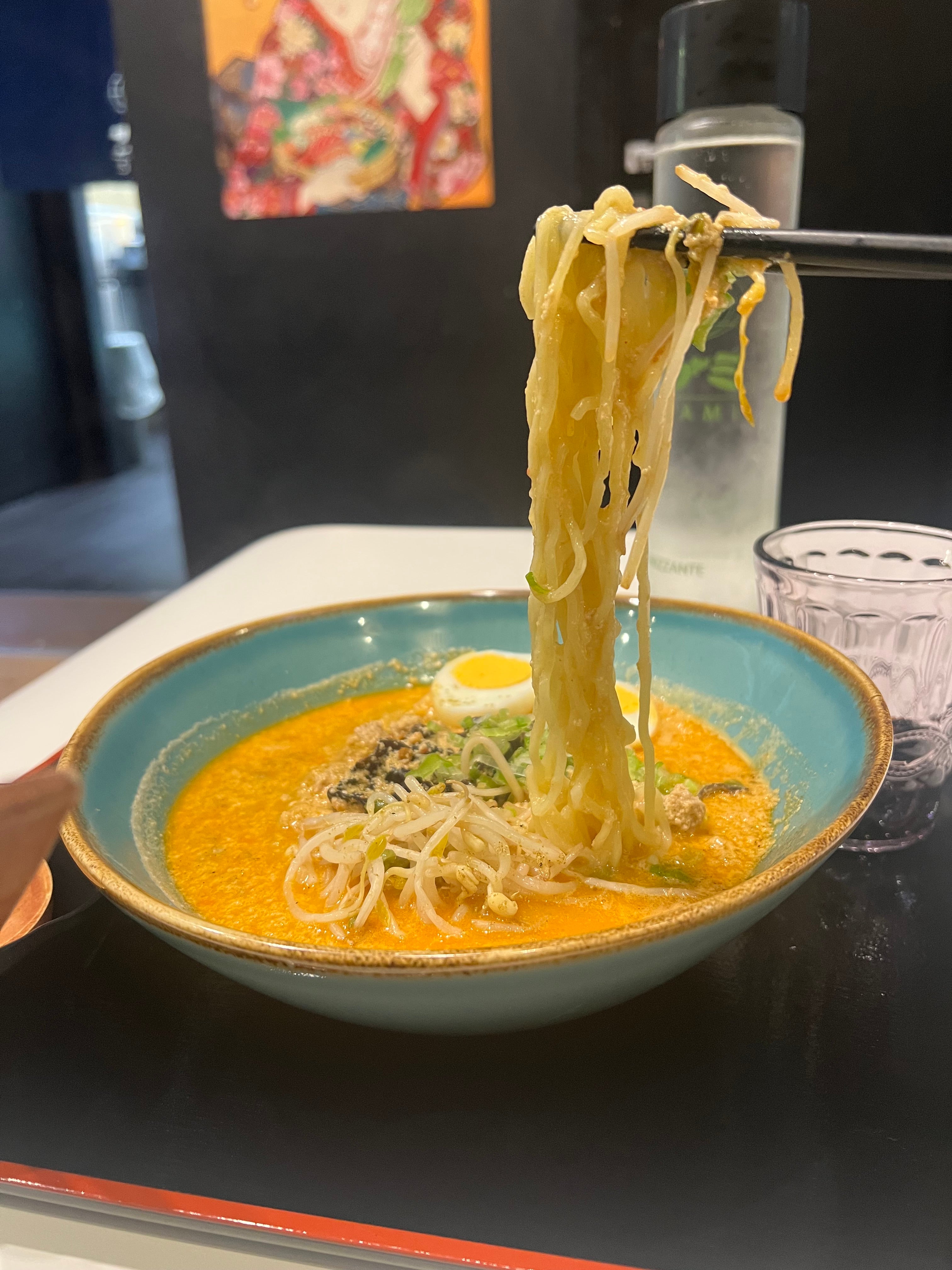 Ramen in zuppa a bese di soia e peperoncino piccante con polpetta e macinato di maiale, germogli di soia e cipollotti15,00 €