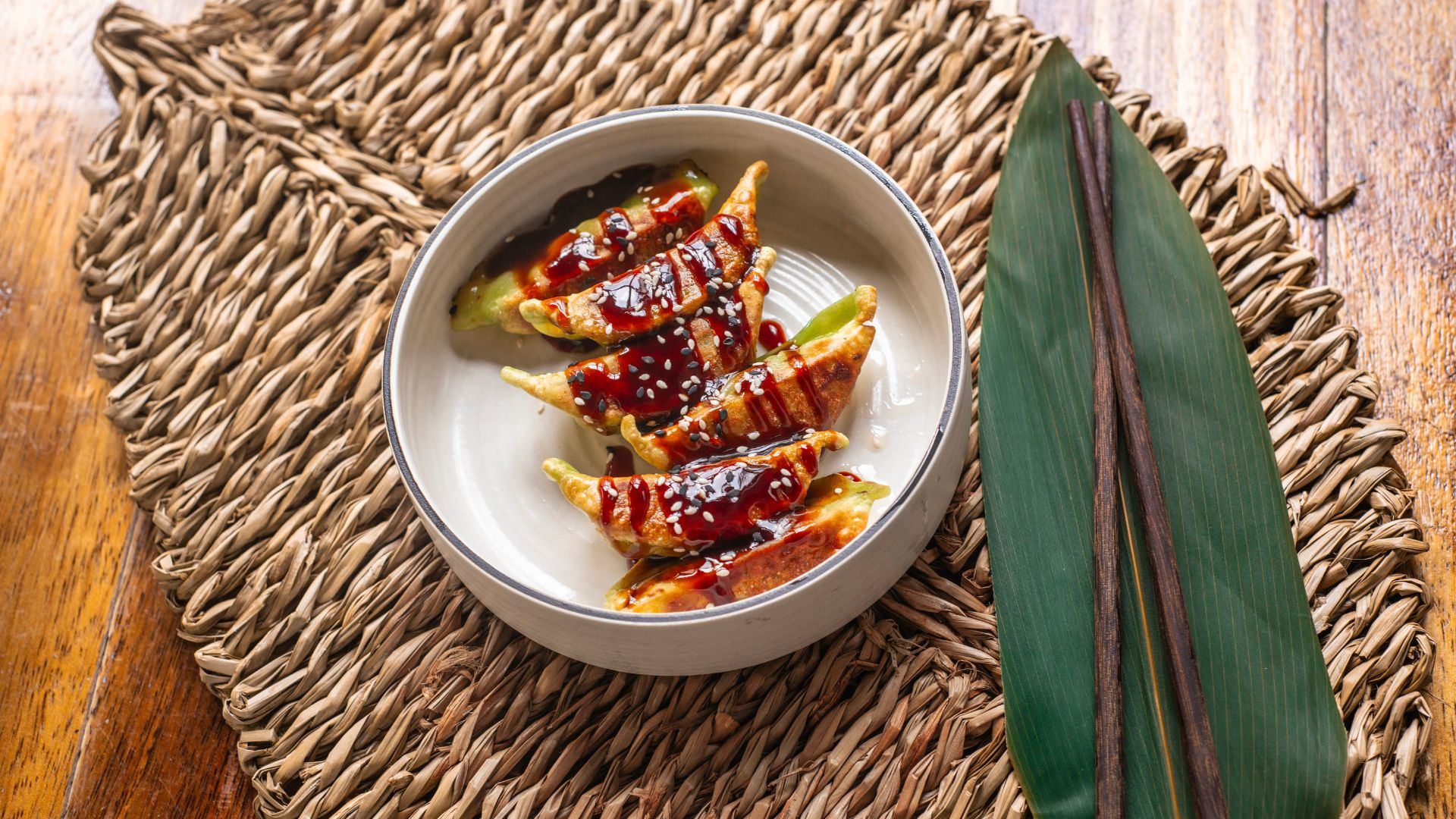 Il nostro raviolo in stile giapponese con sfoglia di farina di grano, gamberi, cavolo, cipollotto, zenzero e aglio (pochissimo). Conditi con la nostra salsa piccante e sesamo e cipolla crispy.La salsa piccante è preparata con una base di soia dolce con aggiunta di sriracha (tipica salsa piccante orientale). Il grado di piccantezza è equilibrato e non esagerato per assaporare al meglio i gyoza.