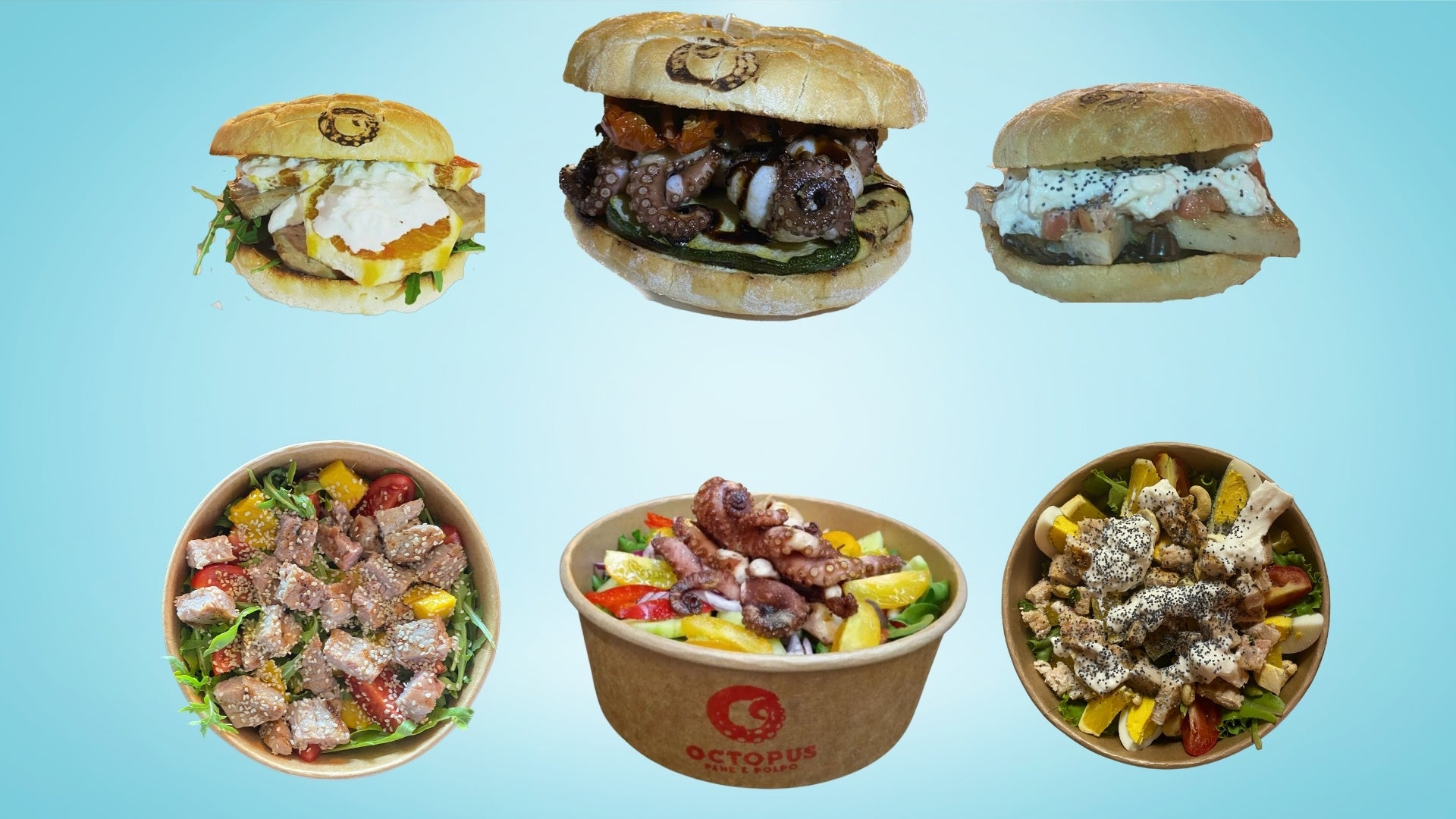 Panino con trancio di pesce spada, melanzana grigliata sott'olio, pomodoro fresco a fette, stracciatella e semi di papavero15,00 €Octopus gourmet