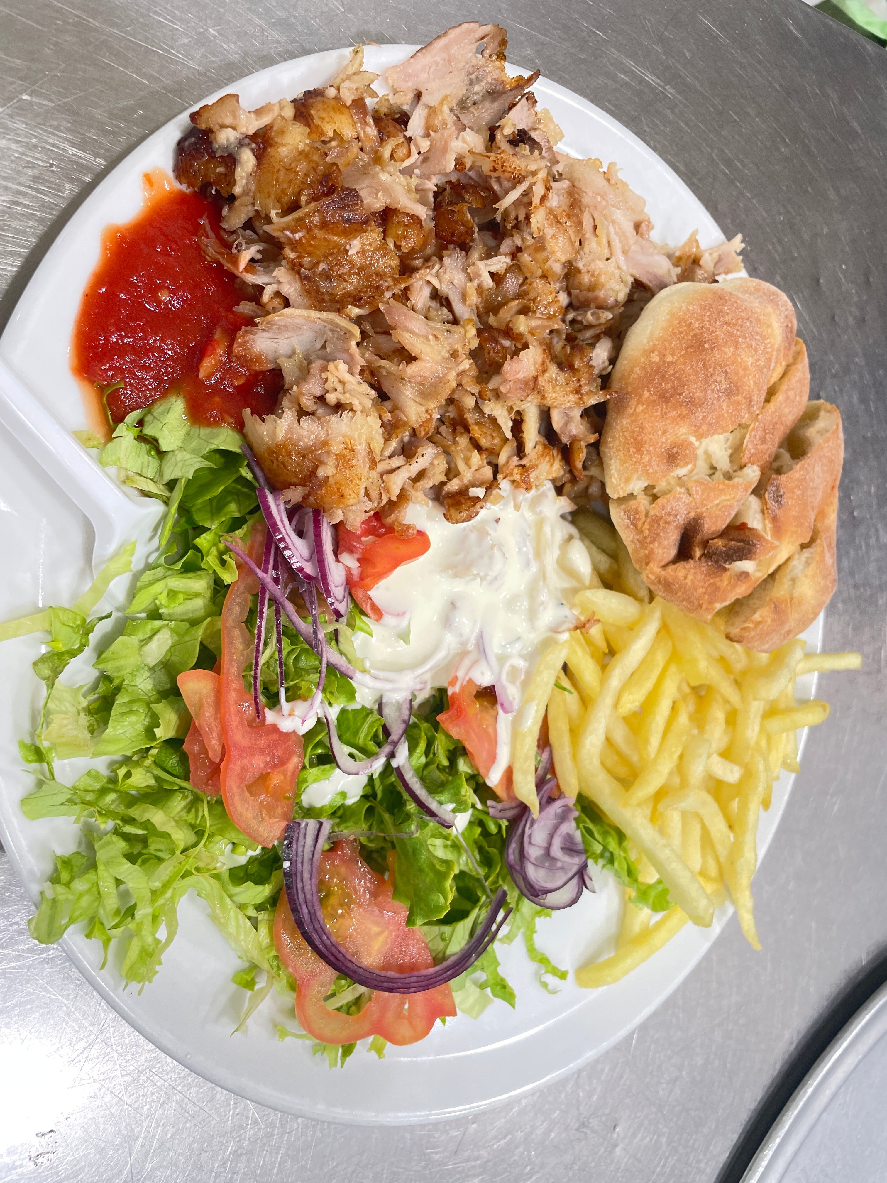 Kebab, pane arabo, insalata, pomodoro, cipolla, peperoni, salsa piccante, salsa yogurt7,90 €PopolarePiatto kebab
