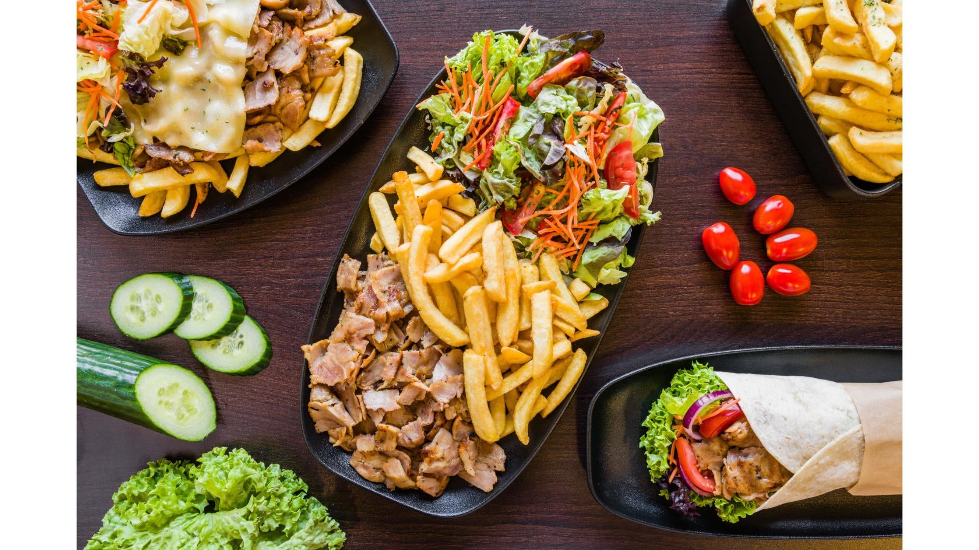 Carne di agnello, spezie, insalata, patatine fritte