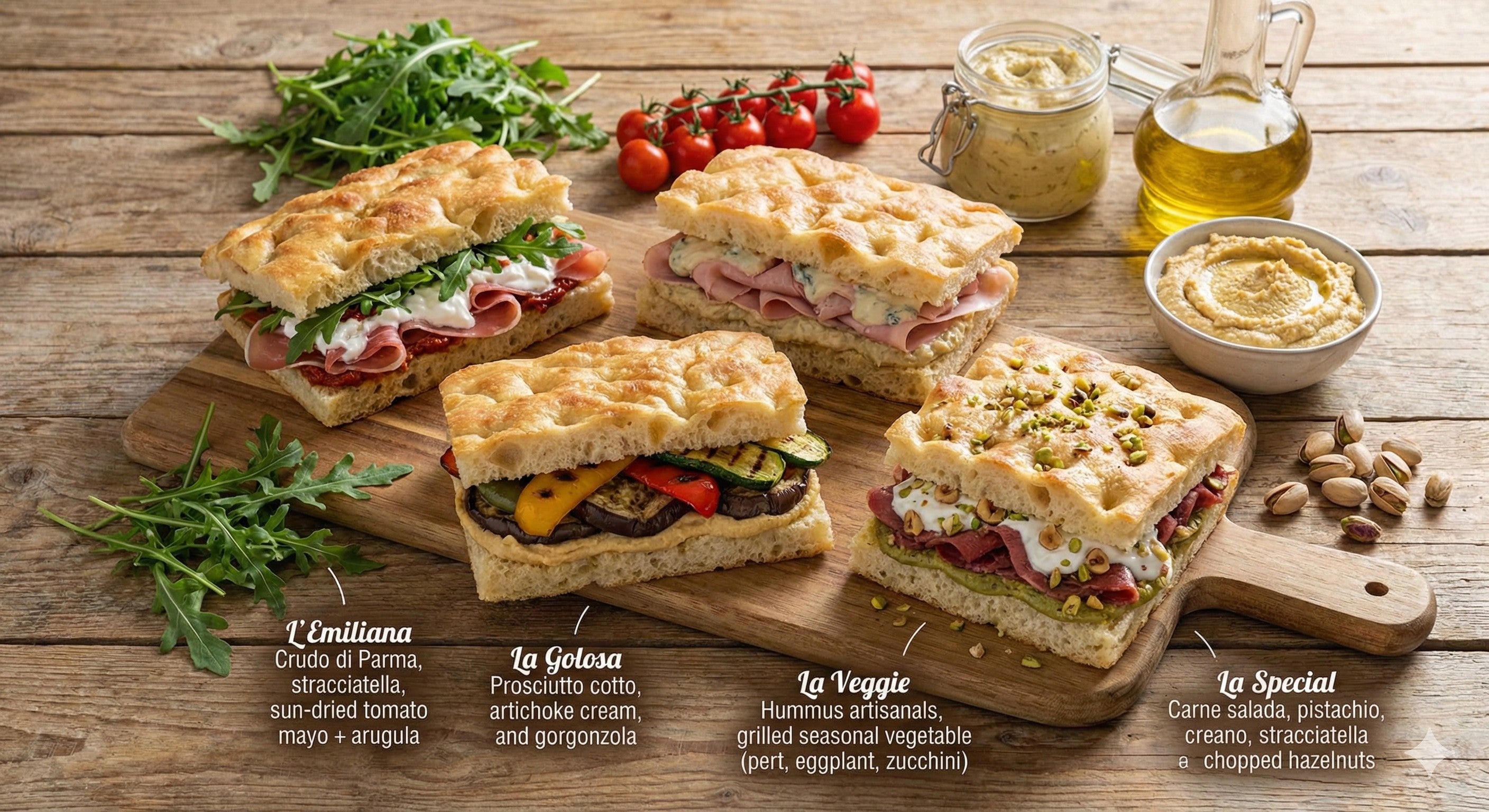 Focacce artigianali ad alta idratazione, croccanti fuori e soffici dentro. Disponibili in più farciture, su ordinazione.