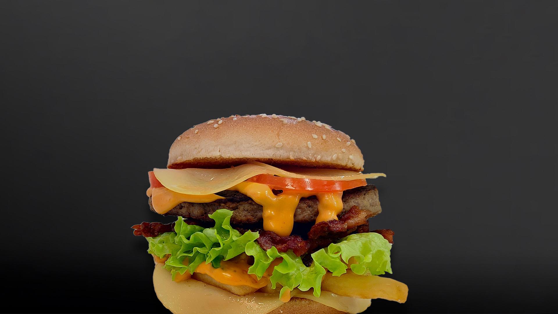 Hamburger da 200gr, doppia scamorza, patate, doppio bacon, pomodori, insalata, salsa burger