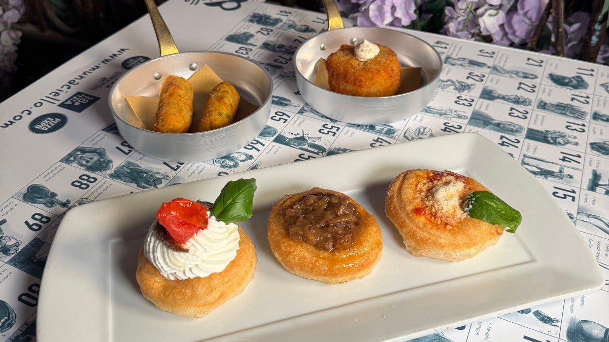 Montanara con ricotta di fuscella e latta di Alici del Cantabrico Rizzoli€15.00Montanara Stracciatella , pesto di nocciole e tartufo