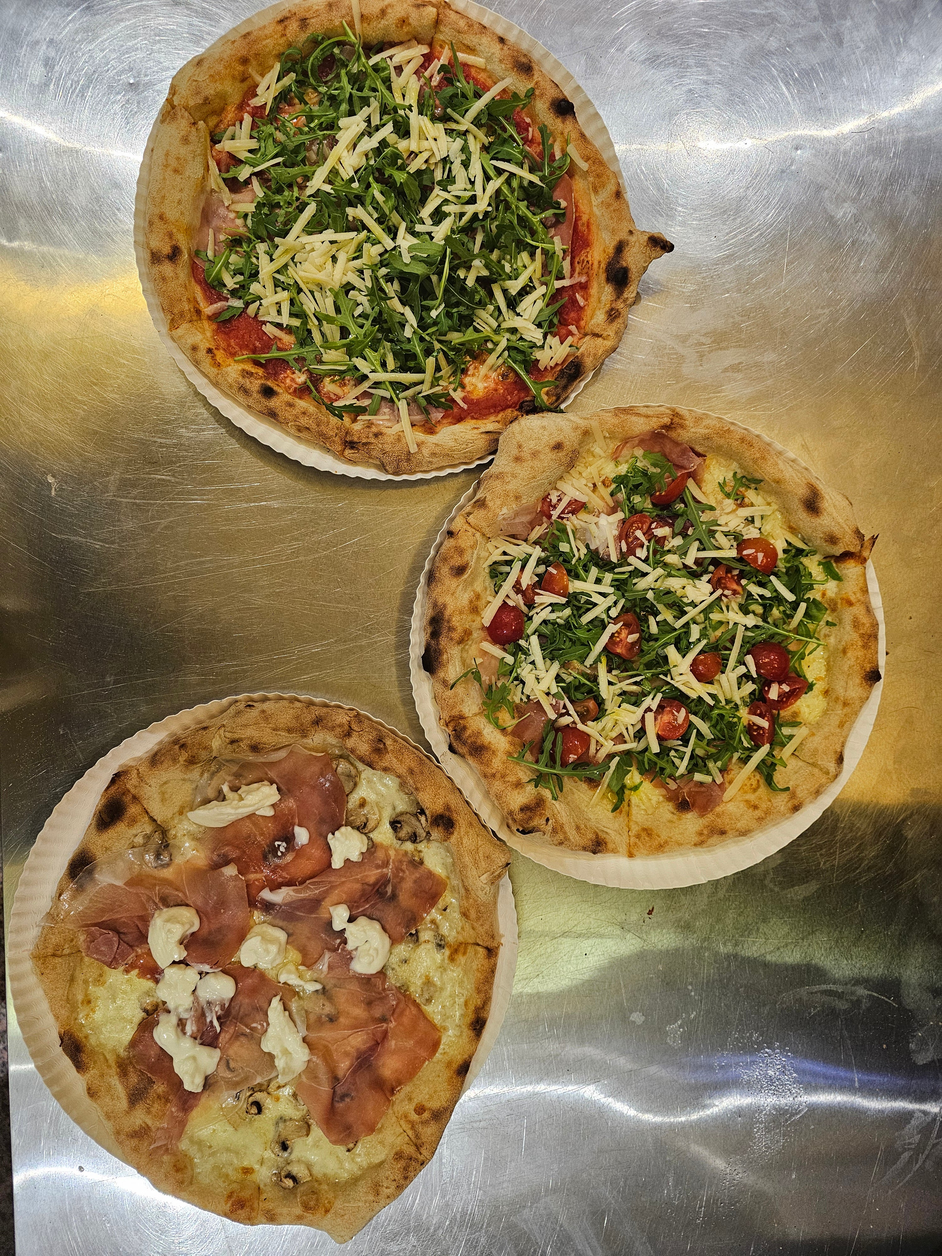 Pomodoro, fior di latte, salamino piccante, Pancetta, gorgonzola dop e olive taggiasche