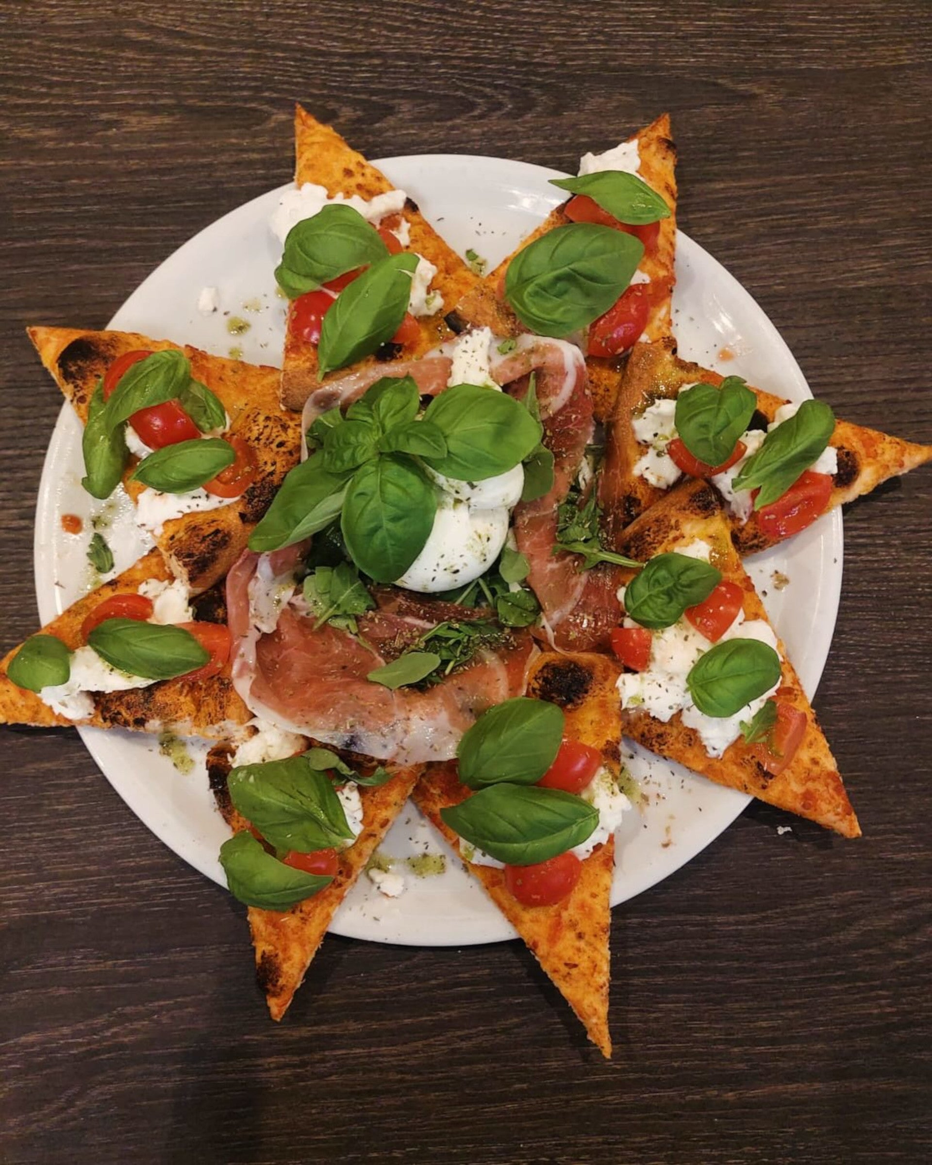 Pomodoro, mozzarella, prosciutto crudo, rucola, grana10,50 €Napoli scomposta